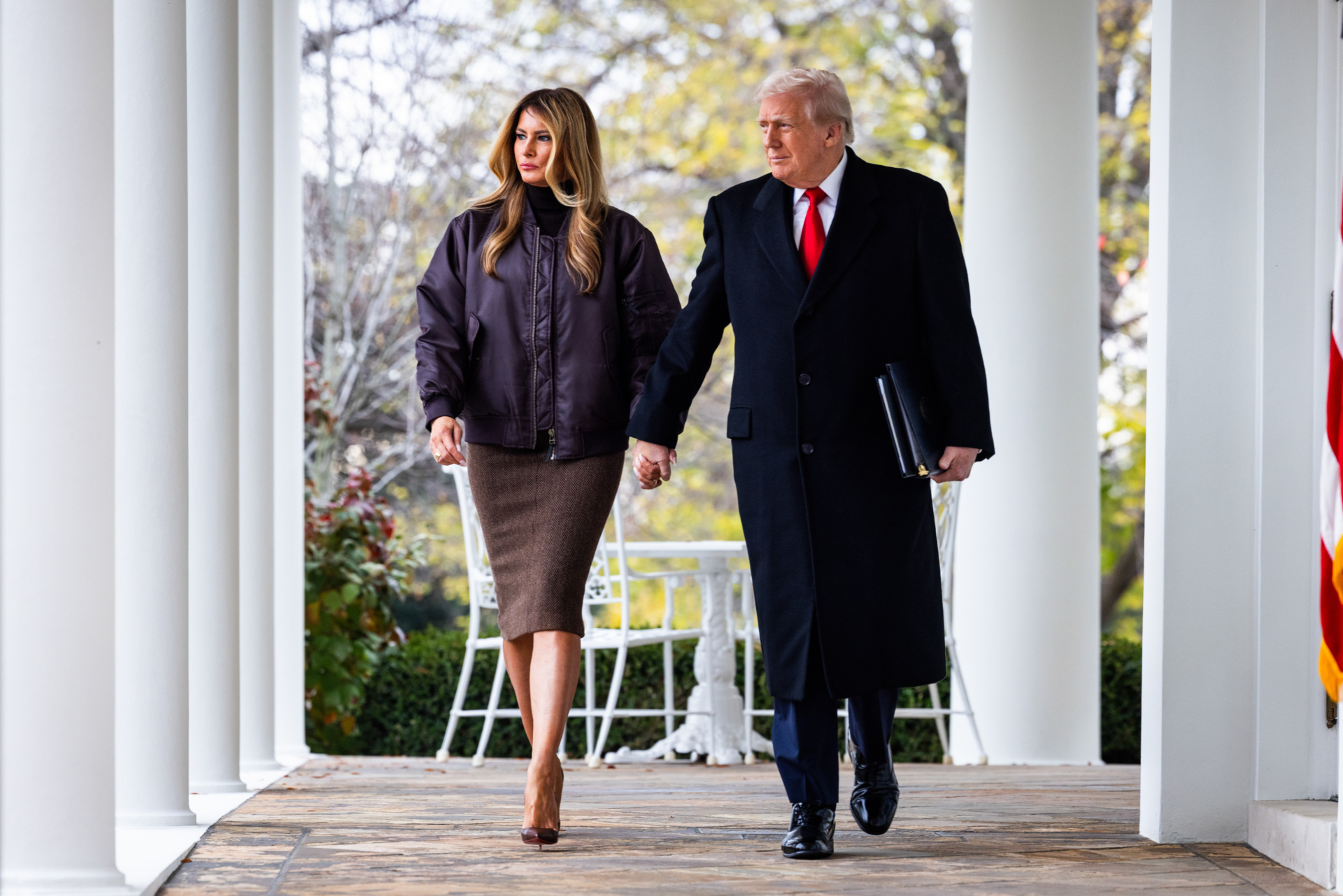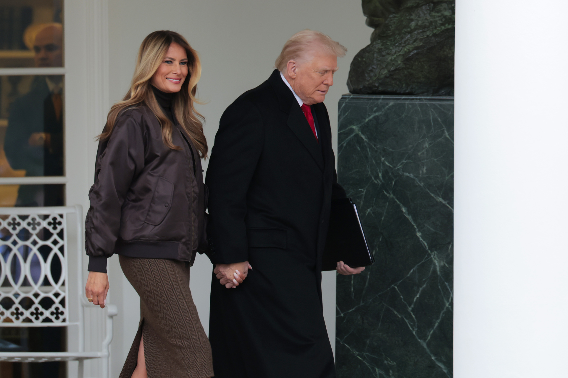WASHINGTON, DC – NOVEMBER 25: First lady Melania Trump (L) and U.S. President Donald Trump depart the Rose Garden after the 78th annual National Thanksgiving Turkey Presentation at the White House on November 25, 2025 in Washington, DC. Trump pardoned Gobble and alternate turkey Waddle, who were both raised in North Carolina and will live out the rest of their lives under the care of the Prestage Department of Poultry Science at North Carolina State University in Raleigh. (Photo by Heather Diehl/Getty Images)