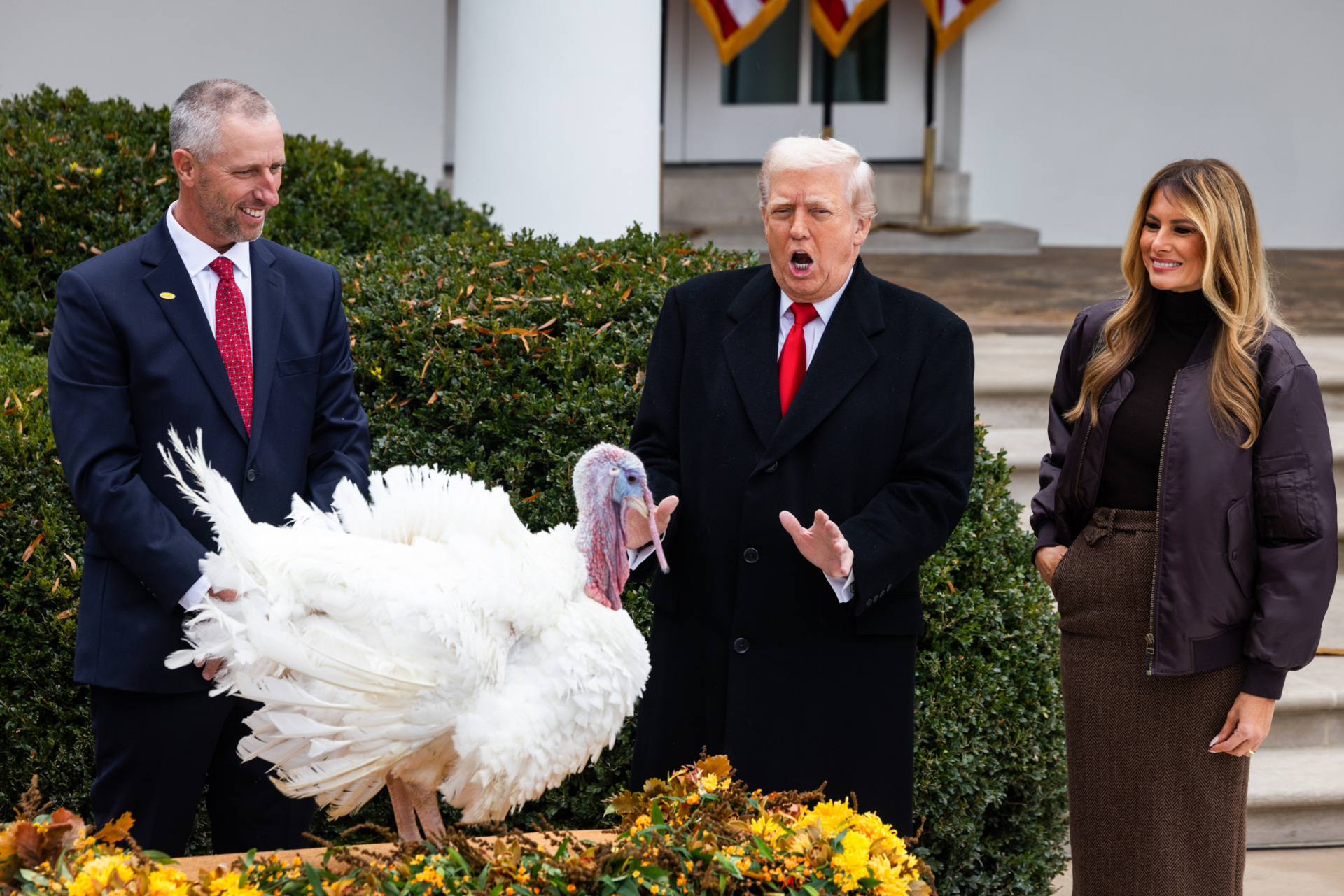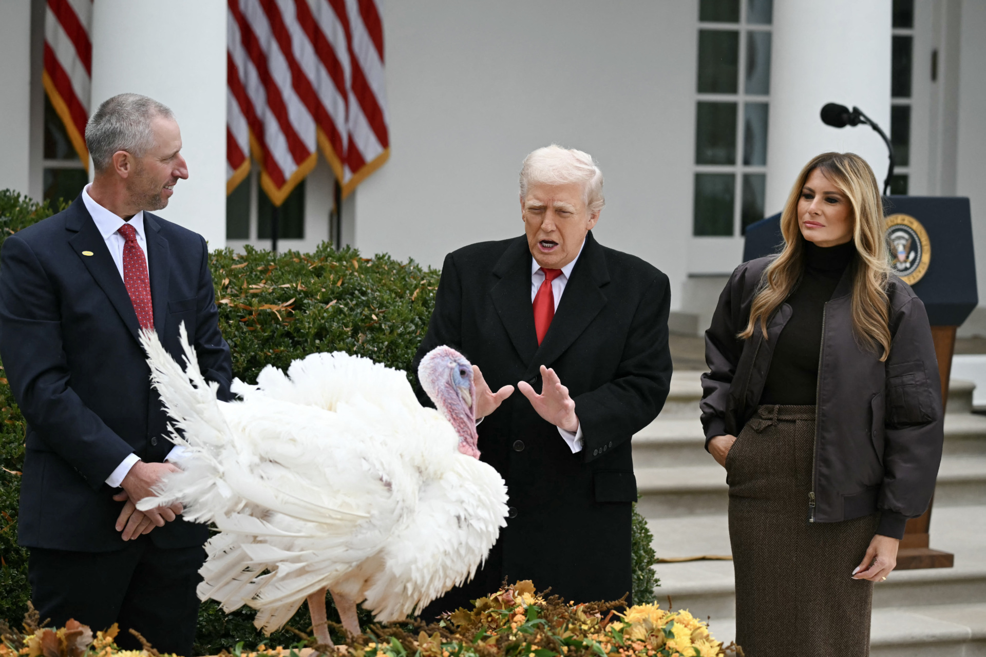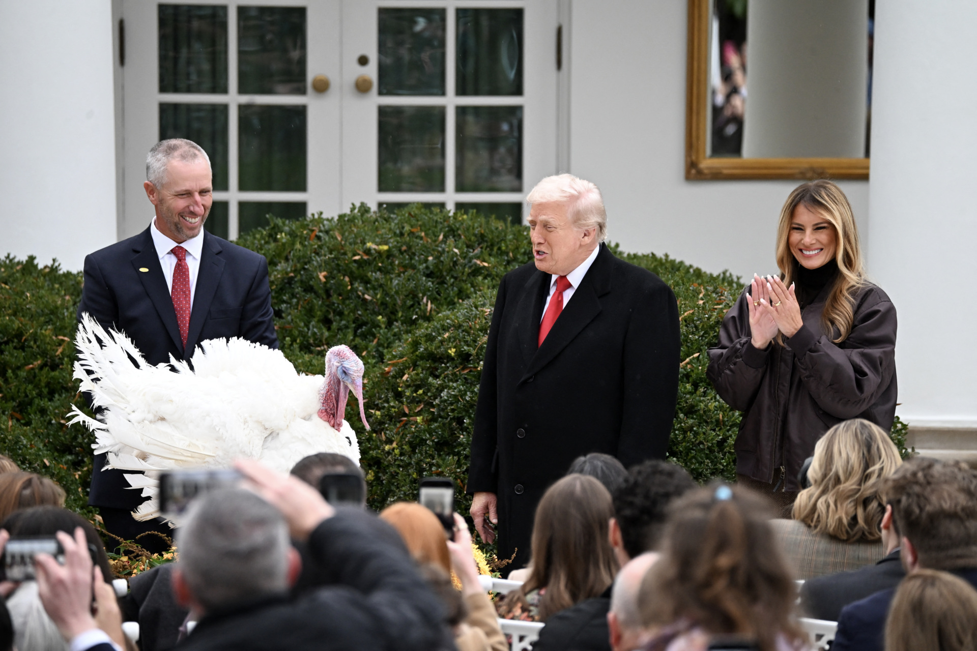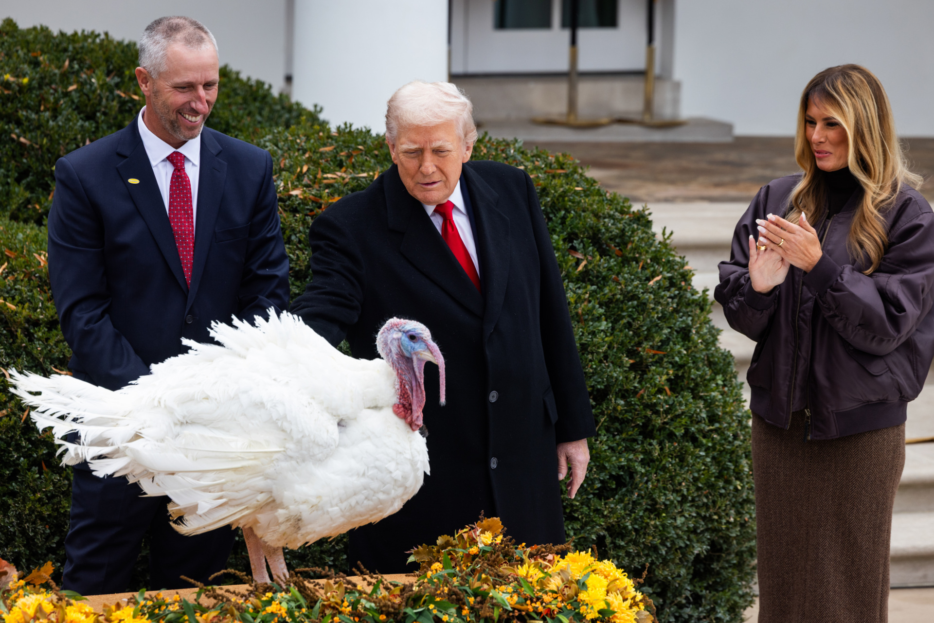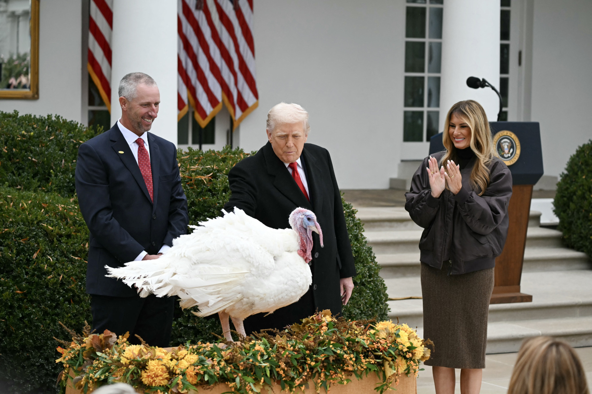 WASHINGTON, DC – NOVEMBER 25: U.S. President Donald Trump (C) pardons National Thanksgiving Turkey Gobble alongside first lady Melania Trump (R) during the 78th annual National Thanksgiving Turkey Presentation in the Rose Garden of the White House on November 25, 2025 in Washington, DC. Trump pardoned Gobble and alternate turkey Waddle, who were both raised in North Carolina and will live out the rest of their lives under the care of the Prestage Department of Poultry Science at North Carolina State University in Raleigh. (Photo by Heather Diehl/Getty Images)