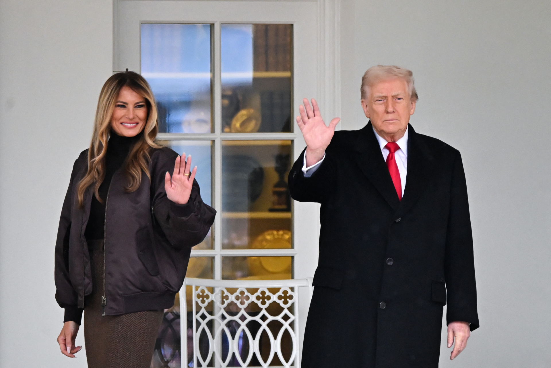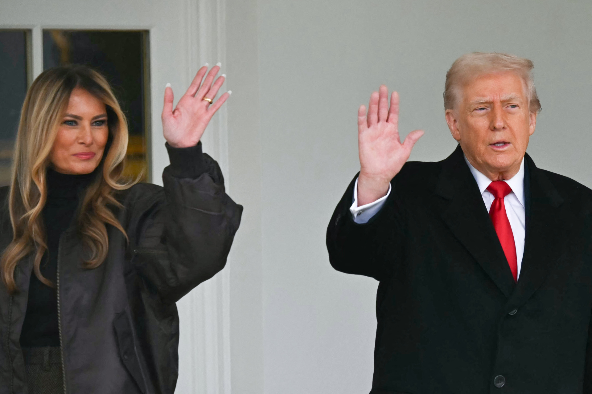 US President Donald Trump and First Lady Melania Trump wave to the audience as they walk back to the Oval Office after participating in the White House turkey pardon ceremony in the Rose Garden of the White House in Washington, DC on November 25, 2025. (Photo by Alex WROBLEWSKI / AFP via Getty Images)