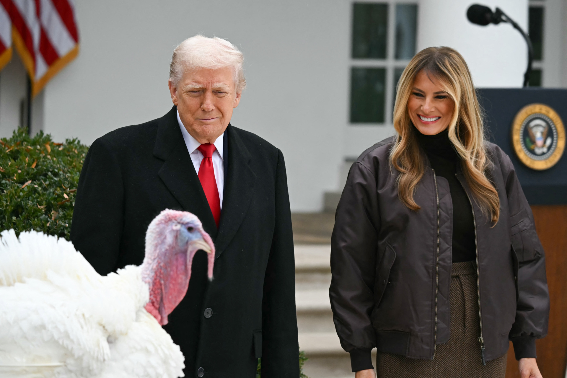 WASHINGTON, DC – NOVEMBER 25: First lady Melania Trump (L) and U.S. President Donald Trump arrive for the 78th annual National Thanksgiving Turkey Presentation in the Rose Garden of the White House on November 25, 2025 in Washington, DC. Trump will pardon Gobble and alternate turkey Waddle, who were both raised in North Carolina and will live out the rest of their lives under the care of the Prestage Department of Poultry Science at North Carolina State University in Raleigh. (Photo by Chip Somodevilla/Getty Images)