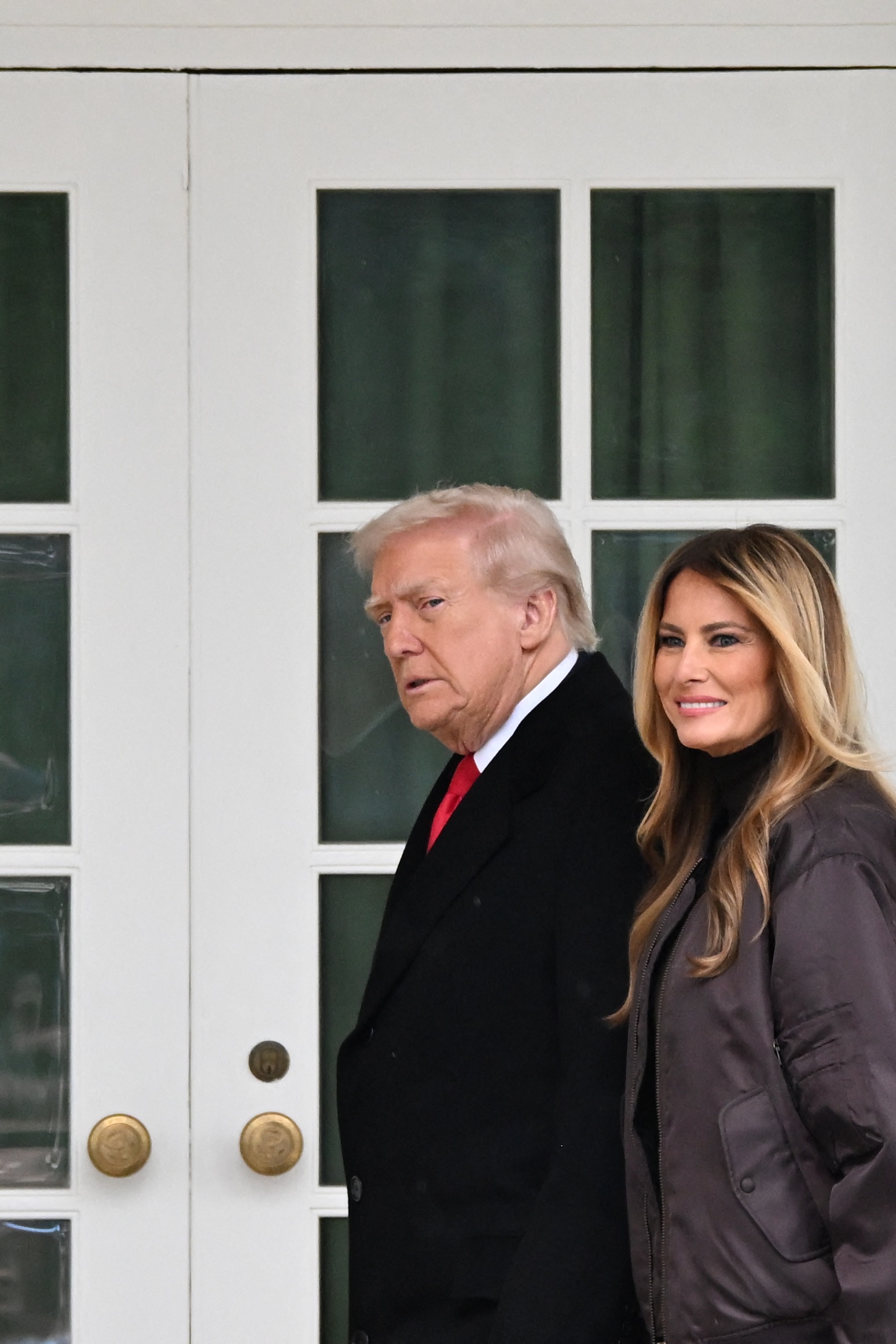 US President Donald Trump and First Lady Melania Trump walk back to the Oval Office after participating in the White House turkey pardon ceremony in the Rose Garden of the White House in Washington, DC on November 25, 2025. (Photo by Alex WROBLEWSKI / AFP via Getty Images)
