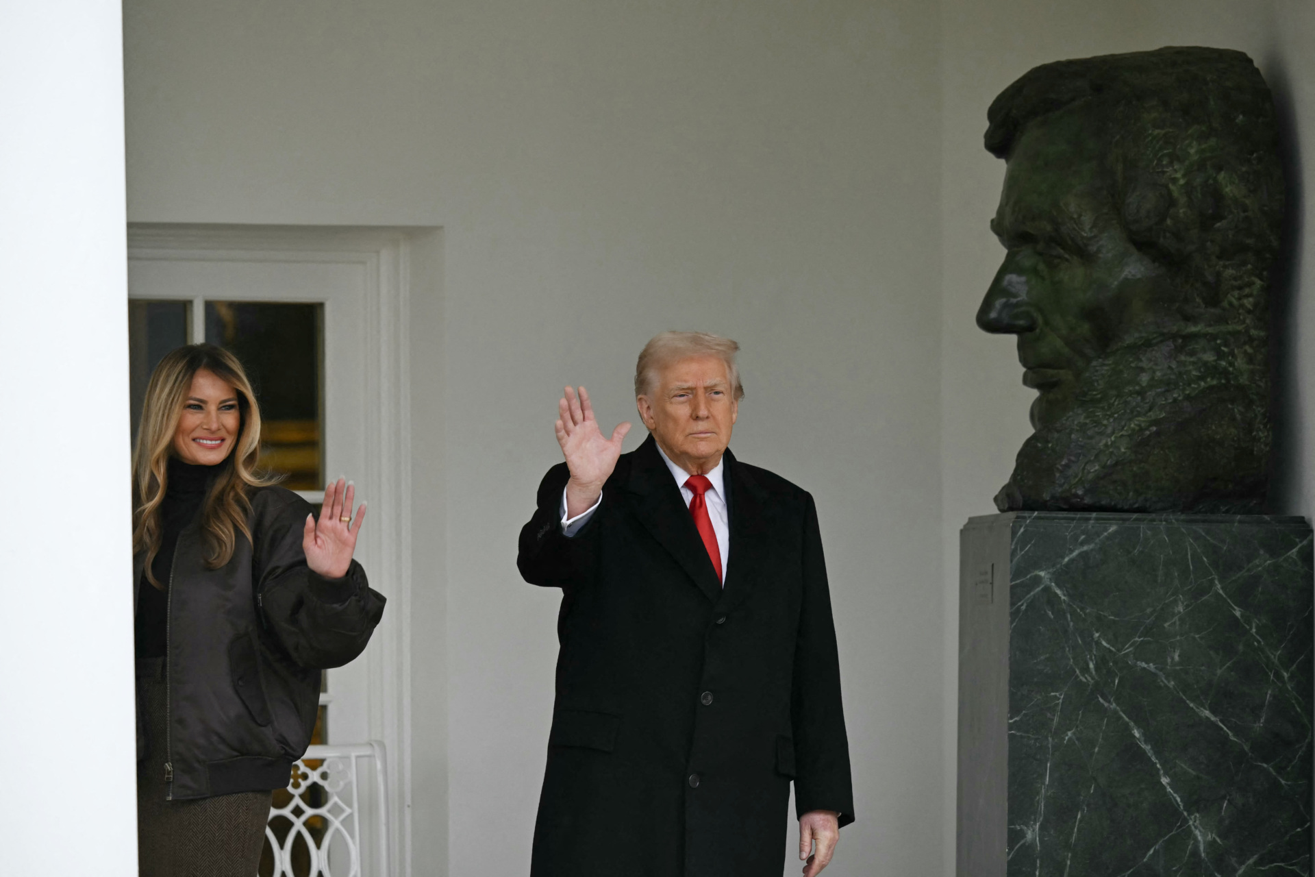 US President Donald Trump and First Lady Melania Trump wave as they walk back to the Oval Office after participating in the White House turkey pardon ceremony in the Rose Garden of the White House in Washington, DC on November 25, 2025. (Photo by ANDREW CABALLERO-REYNOLDS / AFP via Getty Images)