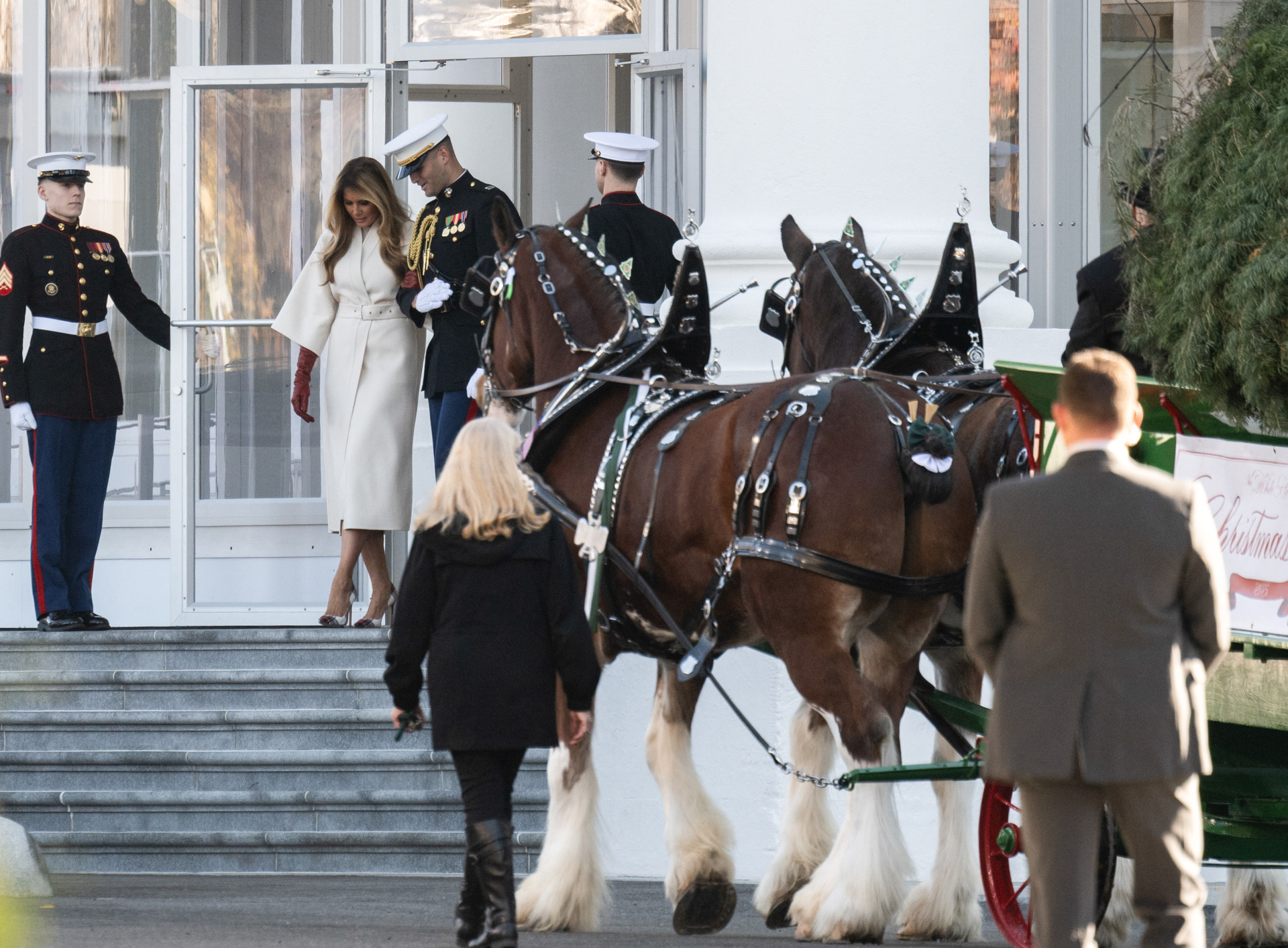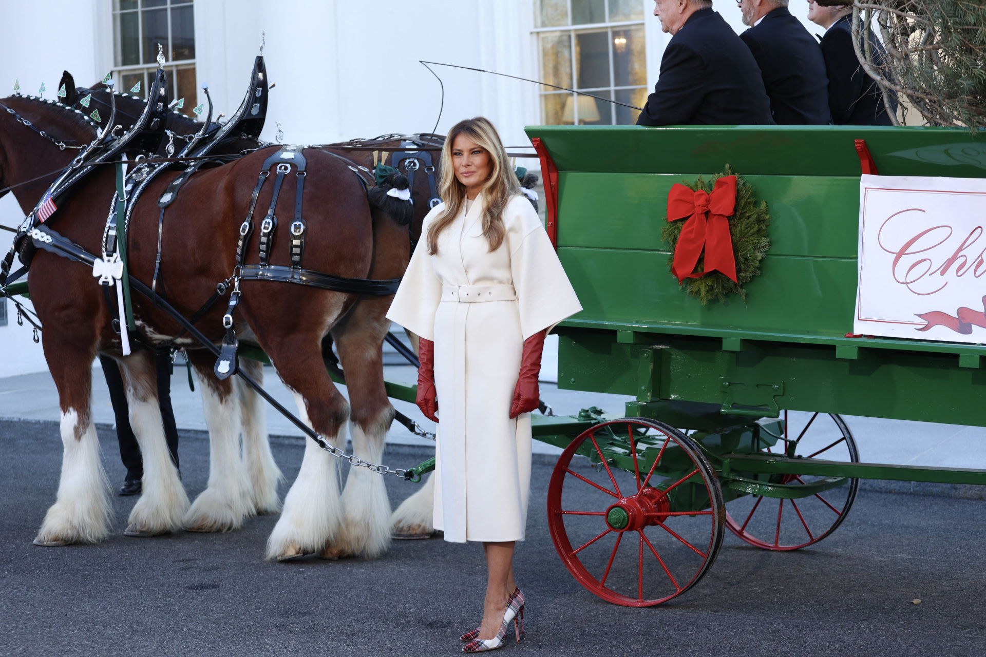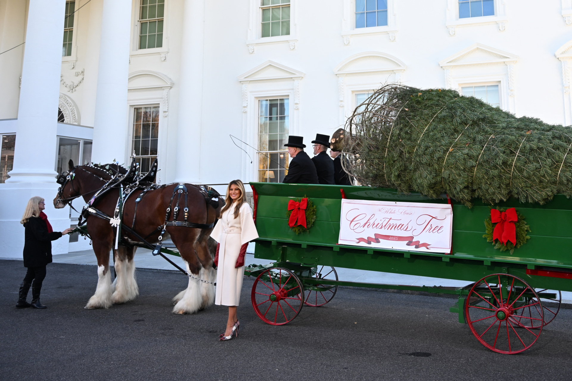 First Lady Melania Trump kicked off the season of giving with a soft, regal look as she accepted the White House Christmas tree, a long-held tradition among first ladies.