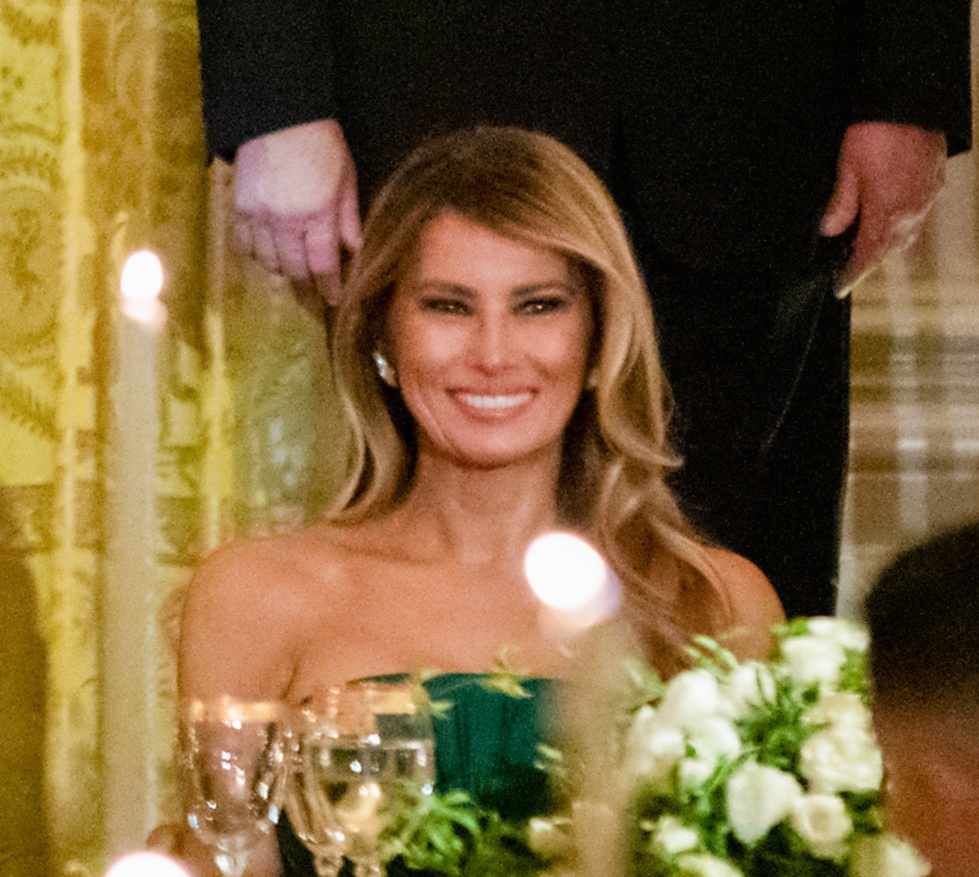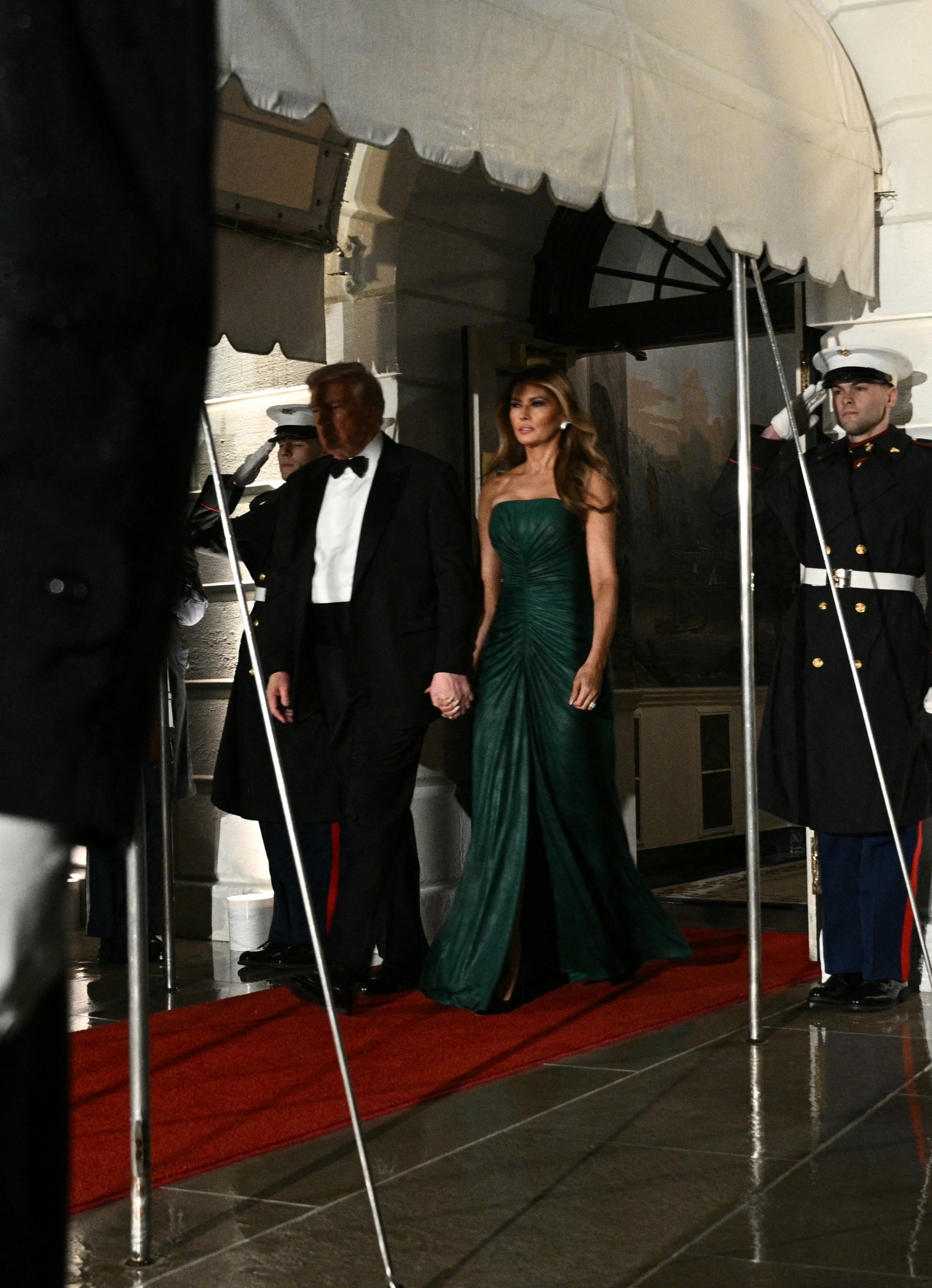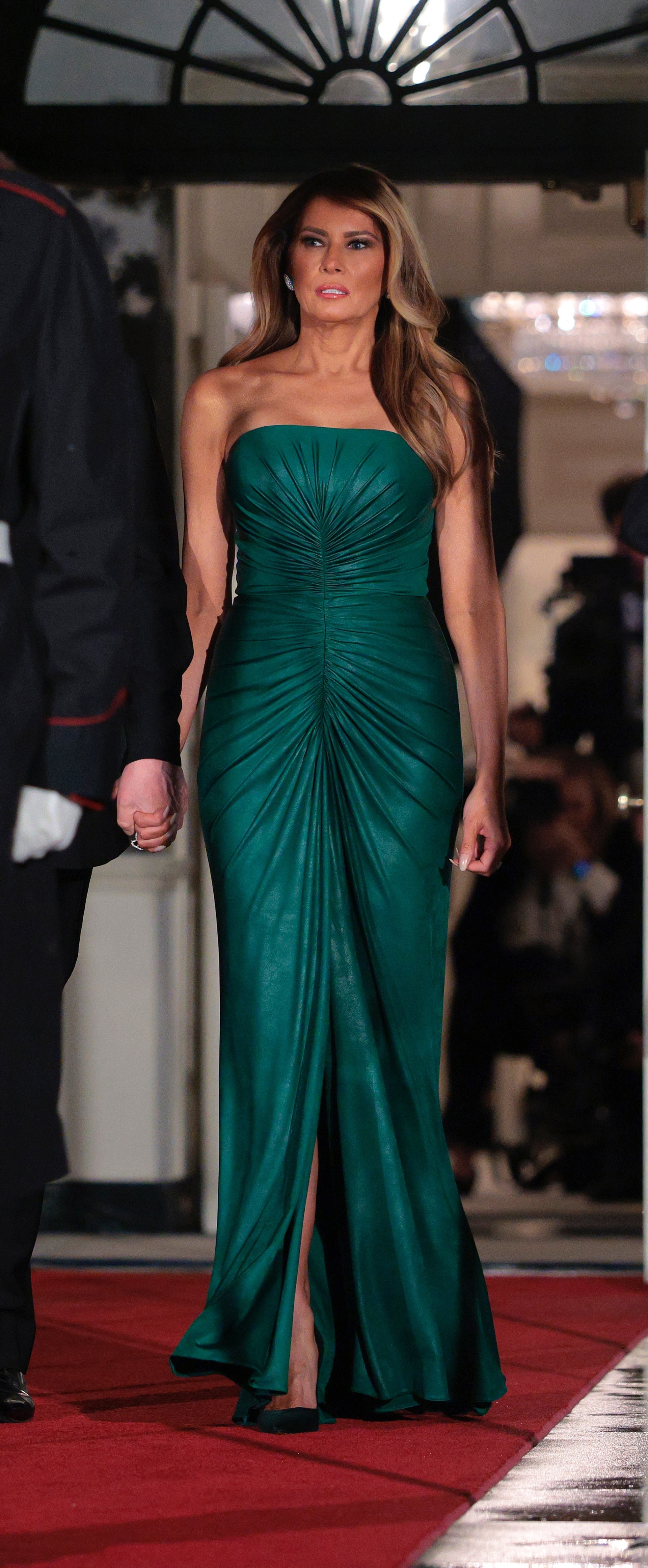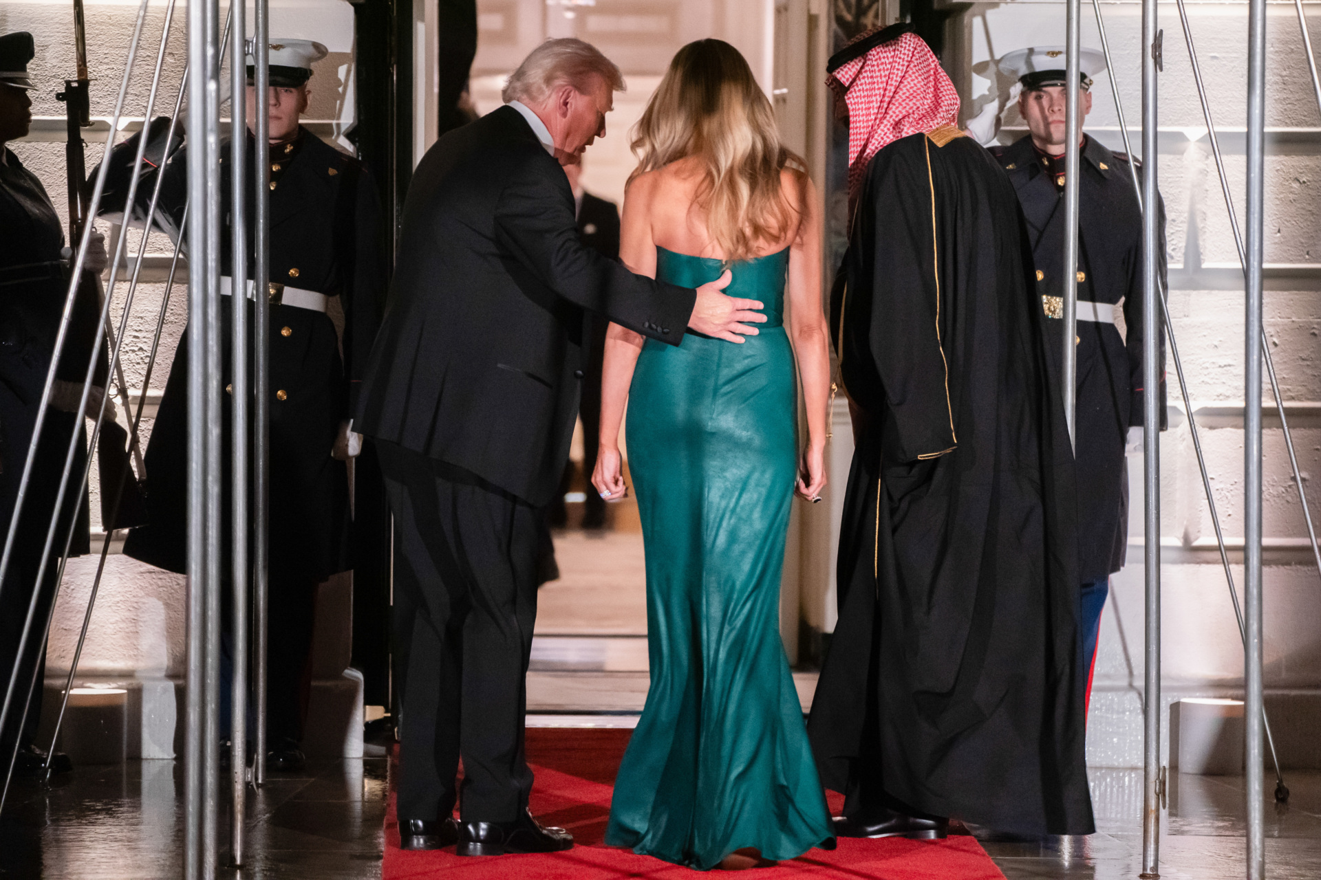 First Lady Melania Trump was elegantly mysterious in an emerald gown for a dinner in the East Room of the White House, where she and the president hosted the Crown Prince of Saudi Arabia.
