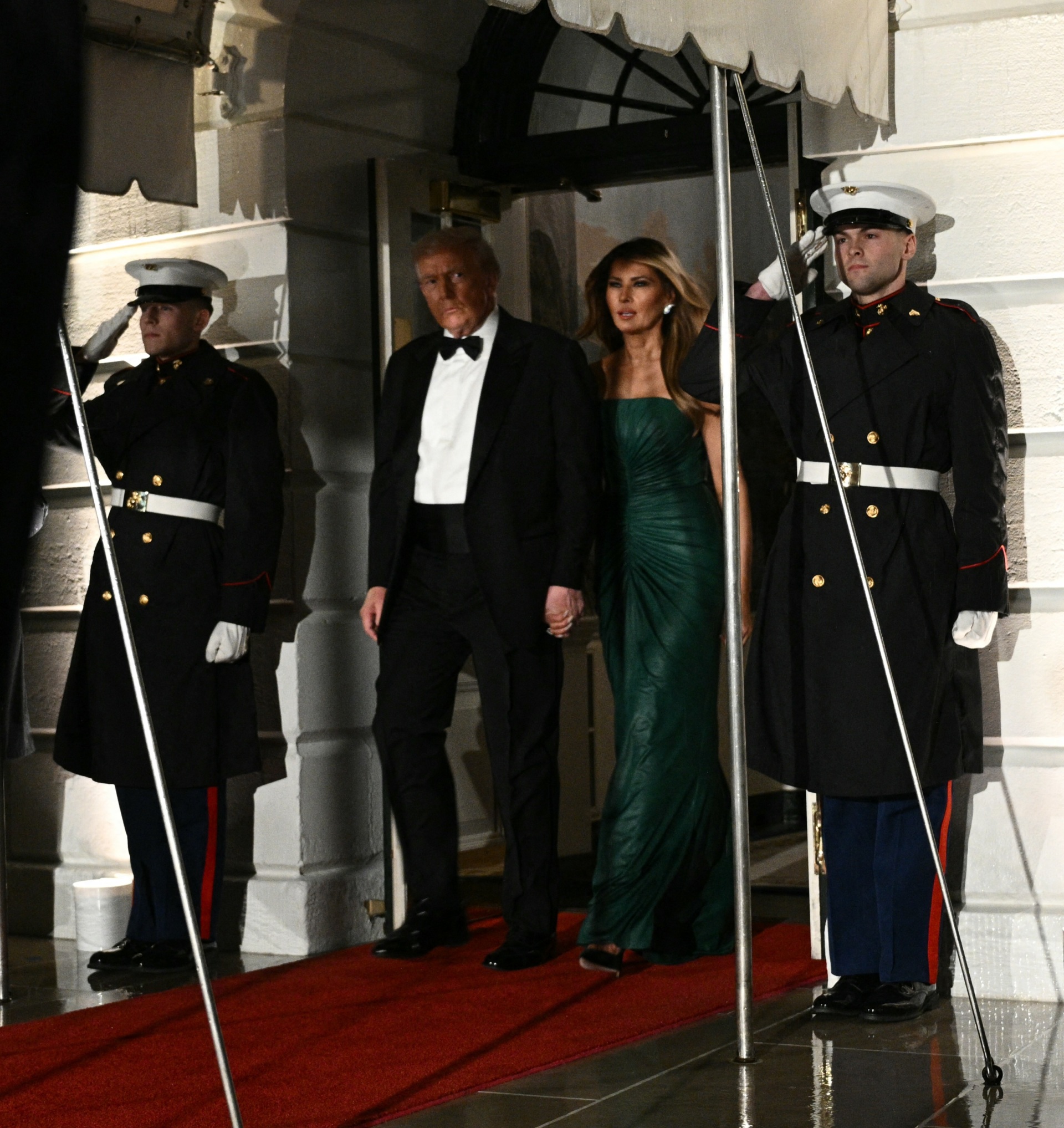 US First Lady Melania Trump, accompanied by President Donald Trump, waits for the arrival of the Crown Prince and Prime Minister of the Kingdom of Saudi Arabia Mohammed bin Salman prior to a state dinner at the White House in Washington, DC on November 18, 2025. (Photo by ANDREW CABALLERO-REYNOLDS / AFP)