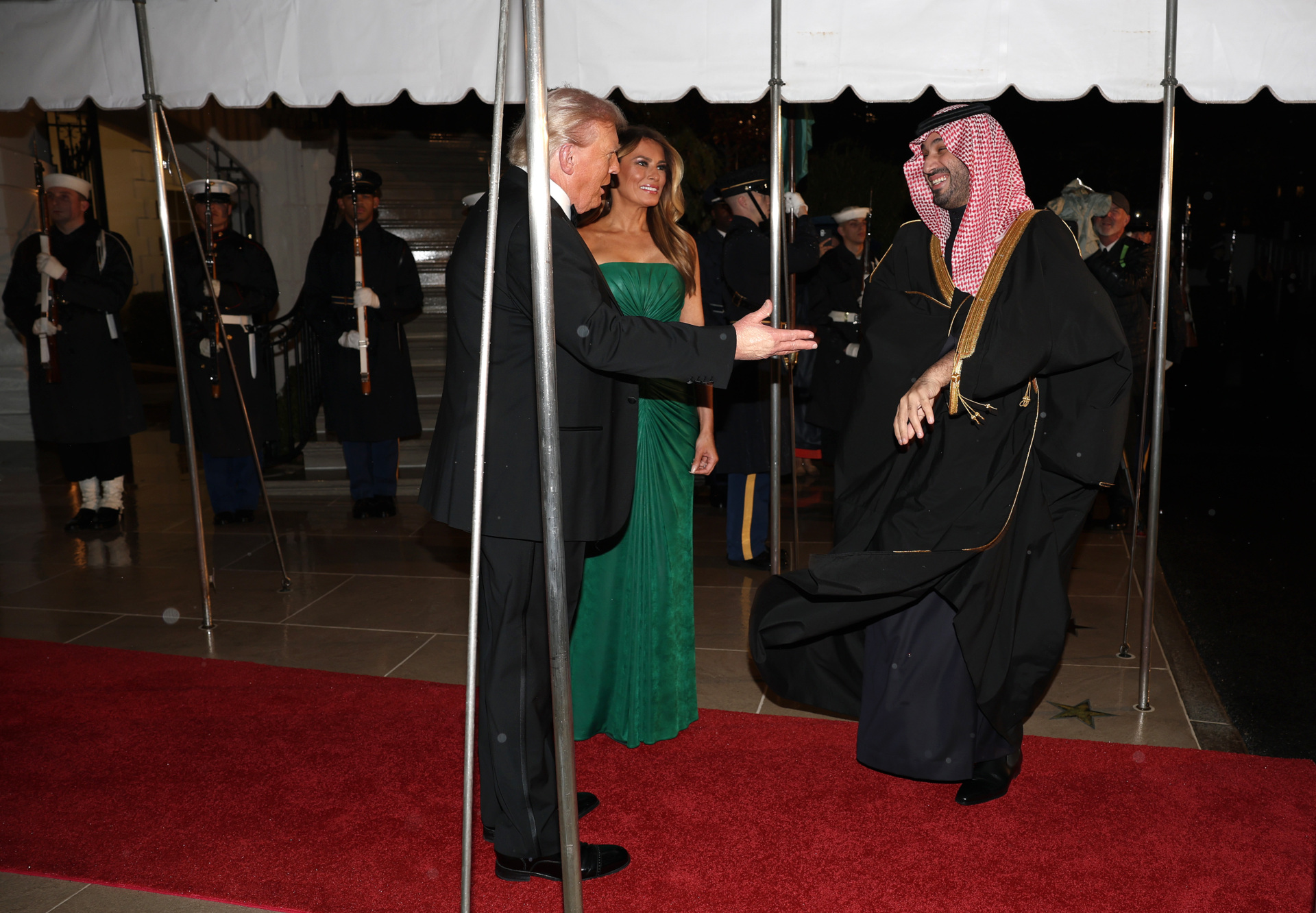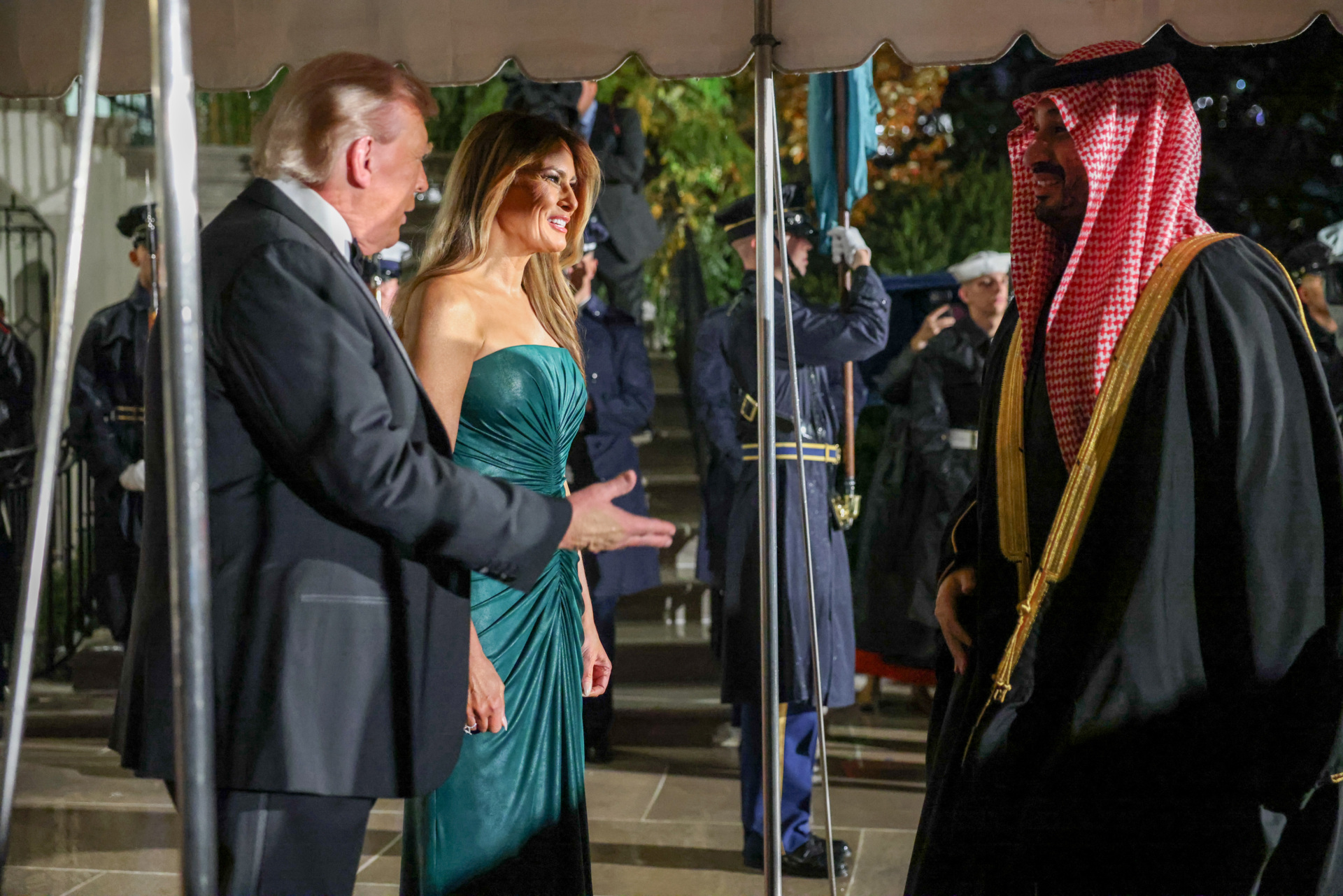 WASHINGTON, DC – NOVEMBER 18: U.S. President Donald Trump, Crown Prince and Prime Minister Mohammed bin Salman of Saudi Arabia, and first lady Melania Trump prepare to attend a dinner at the White House on November 18, 2025 in Washington, DC. Trump is hosting the Crown Prince for meetings aimed at strengthening economic and defense ties, including the U.S. sale of F-35 fighter jets to Saudi Arabia. (Photo by Win McNamee/Getty Images)