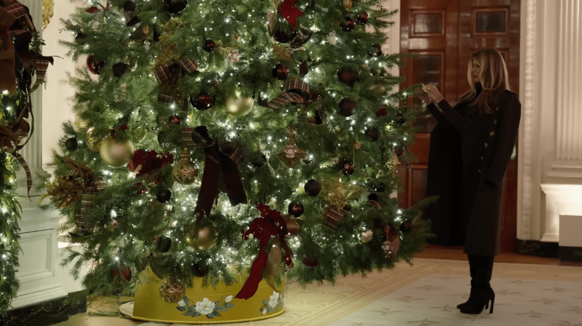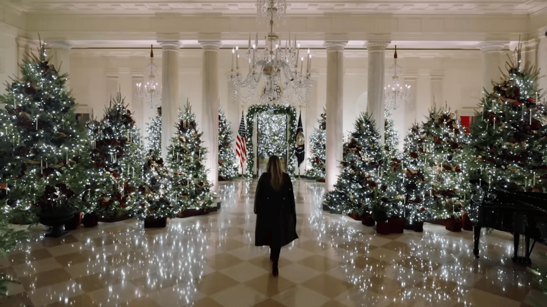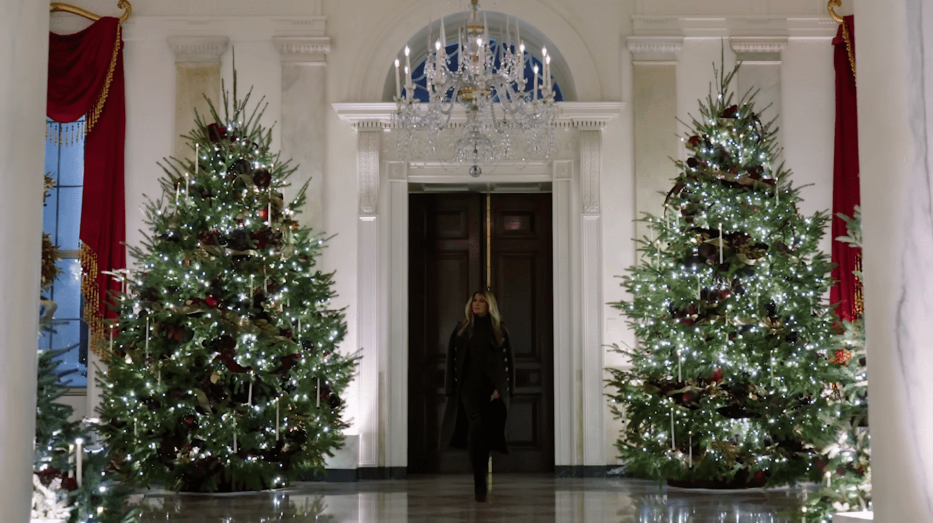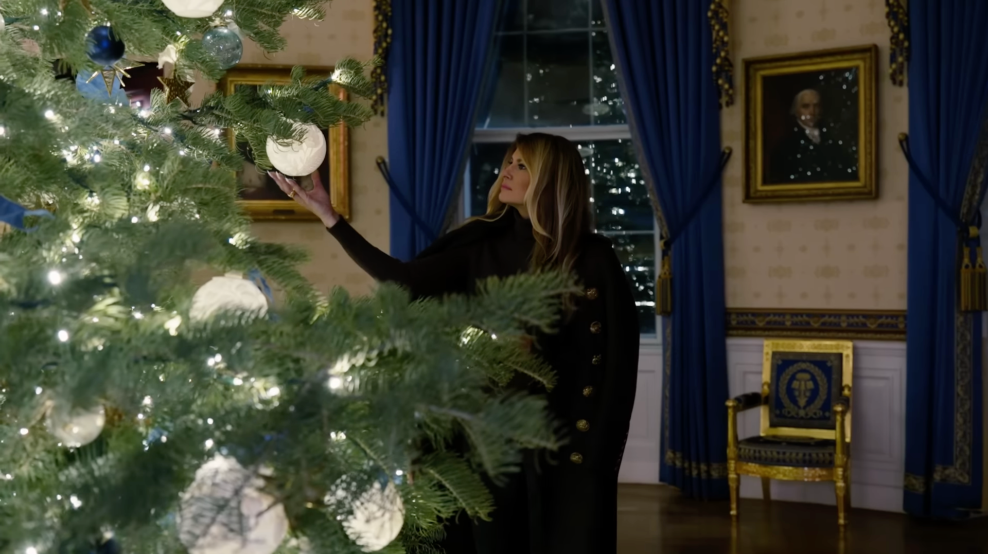 First Lady Melania Trump unveiled the White House Christmas decorations on Monday, wearing winter’s most coveted coat — the 2010s military jacket.