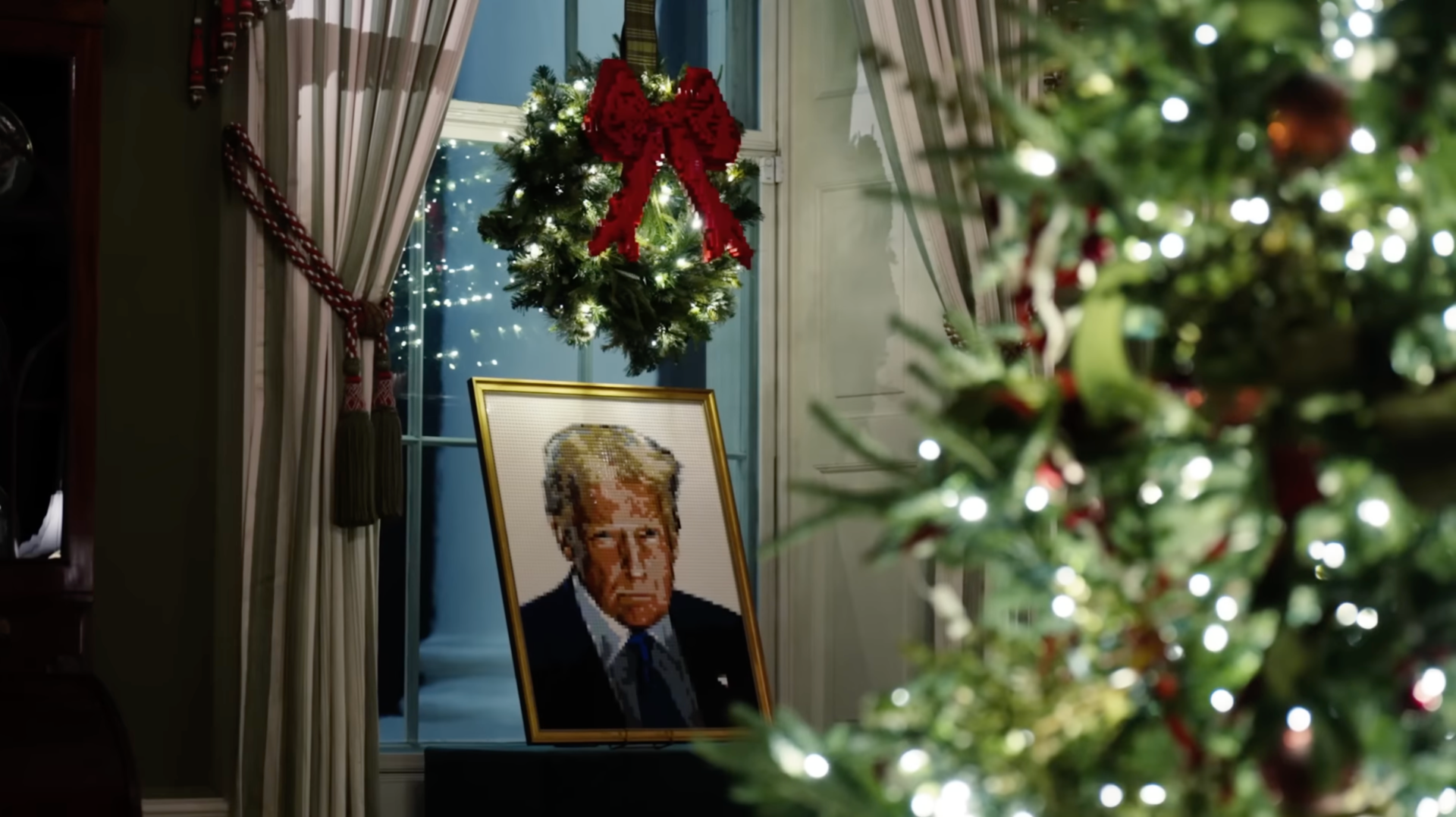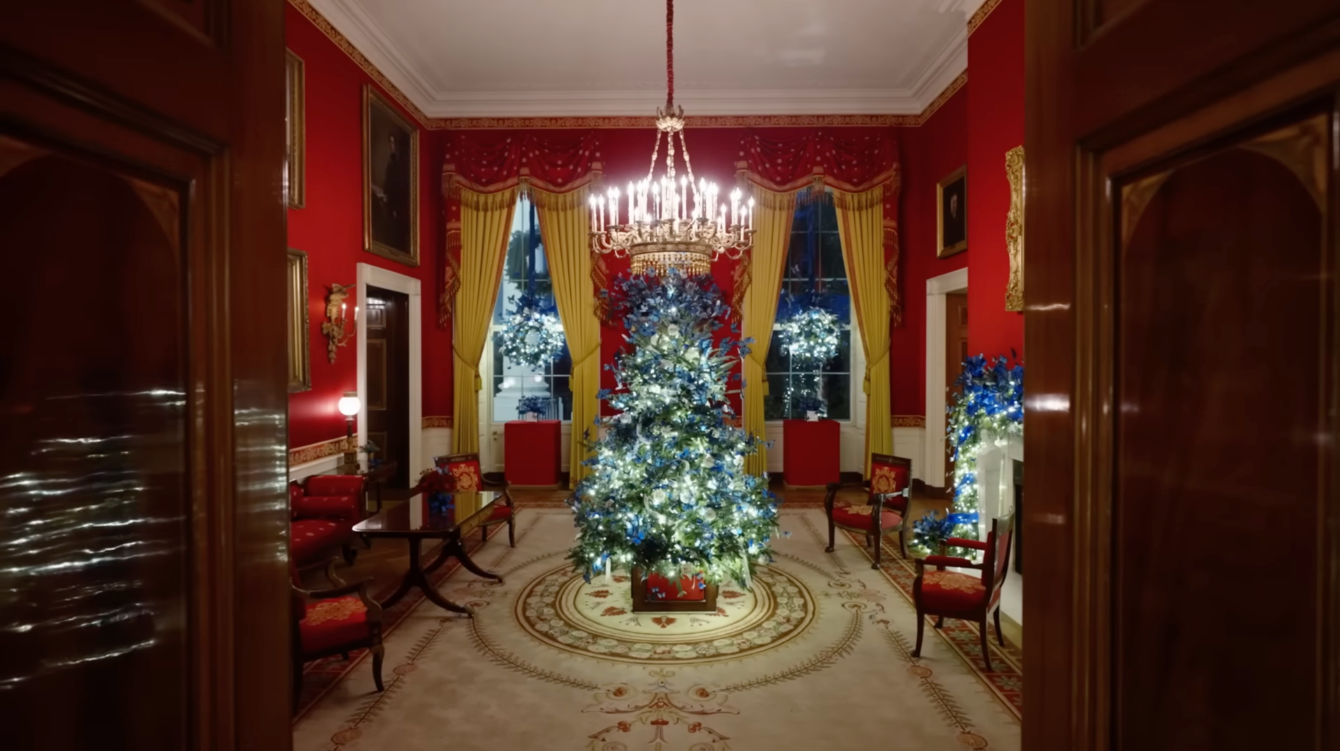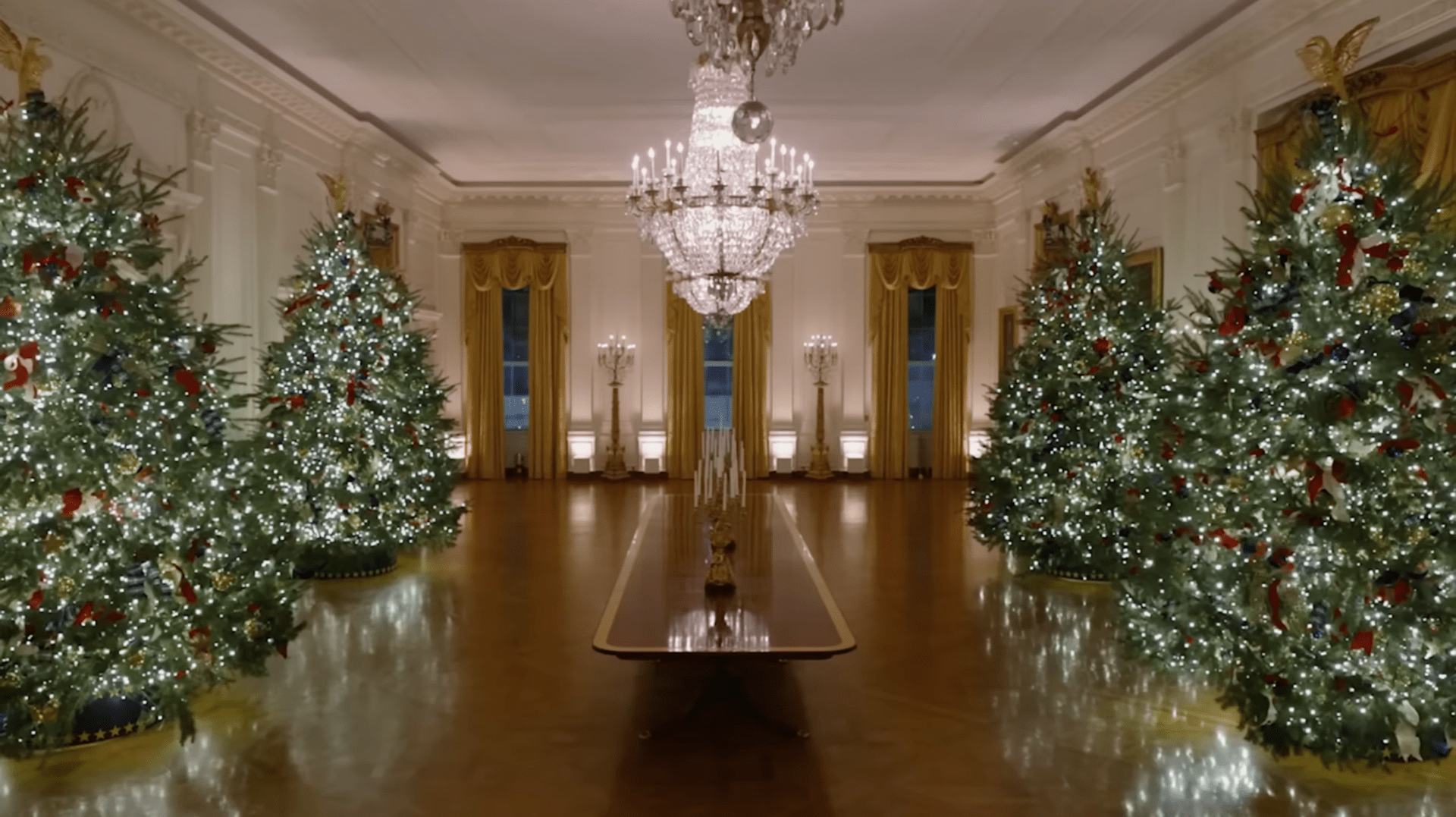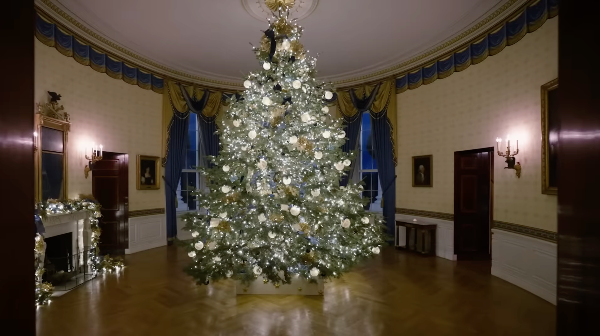 First Lady Melania Trump unveiled the White House Christmas decorations on Monday, wearing winter’s most coveted coat — the 2010s military jacket.
