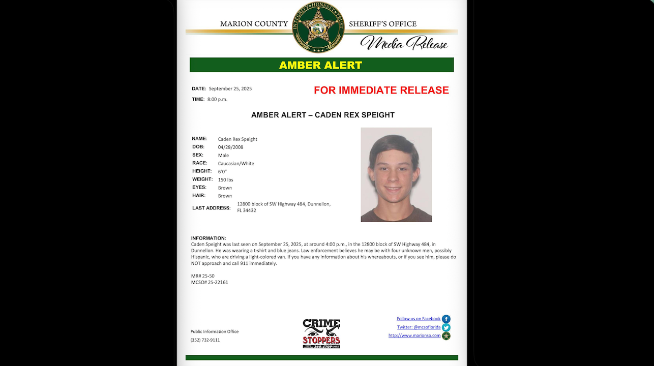 The Marion County Sheriff’s Office issued an Amber Alert Thursday night stating that Speight was last seen around 4 p.m. Thursday in the 12800 block of SW Highway 484 in Dunnellon, which is about an hour south of Gainesville.