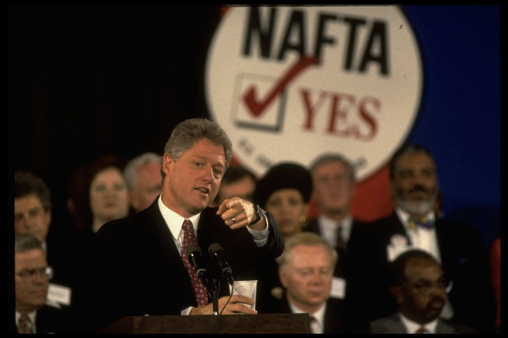 File/President Bill Clinton addressing a Chamber of Commerce group in 1993 re. benefits of North America Free Trade Agreement (NAFTA), below pro-NAFTA banner. (Photo by Diana Walker/Getty)