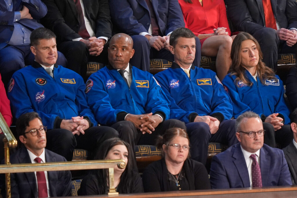 Astronauts for the upcoming Artemis II mission listen as President Donald Trump delivers the State of the Union address to a joint session of Congress in the House chamber at the U.S. Capitol in Washington, Tuesday, Feb. 24, 2026. (AP Photo/Mark Schiefelbein)
