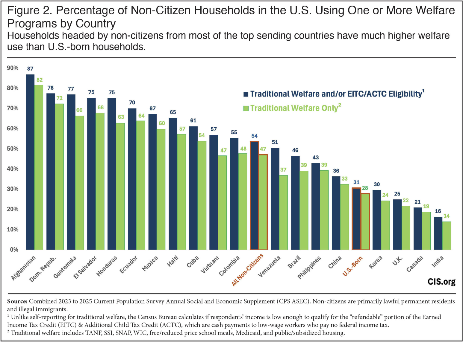The CIS analysis looked at the Current Population Survey Annual Social and Economic Supplement to learn which countries have the most immigrant welfare-users in the U.S.