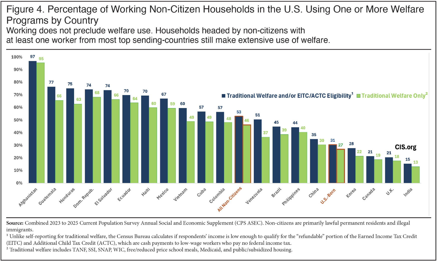 Meanwhile, just 28 percent of households headed by native-born Americans are on welfare, and just 31 percent are on welfare that includes both tax credits.