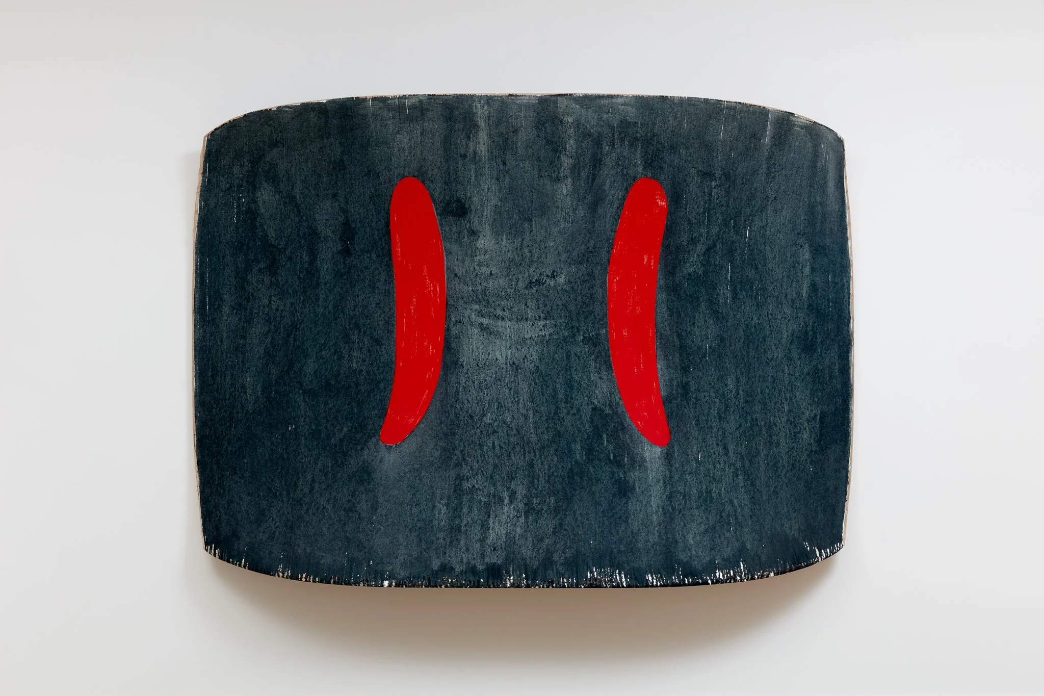 On the left-hand wall, the viewer’s gaze is captured by a looming presence. Spice of Life II (2017) is a relatively recent example of a form used repeatedly by Ron Gorchov since he invented it in the early 1970s. Employing only two colors (a black background with two thick convex red strokes in the middle) painted on a largescale, bending canvas that appears both concave and convex, Spice of Life II is a good representation of Gorchov’s interest in playing with perception. Every time you see one of his works, it is an “aha!” moment. At the same time, one wonders whether this replication is getting old. Still, it is undeniable that Gorchov created one of the motifs most associated with the shaped-canvas movement.