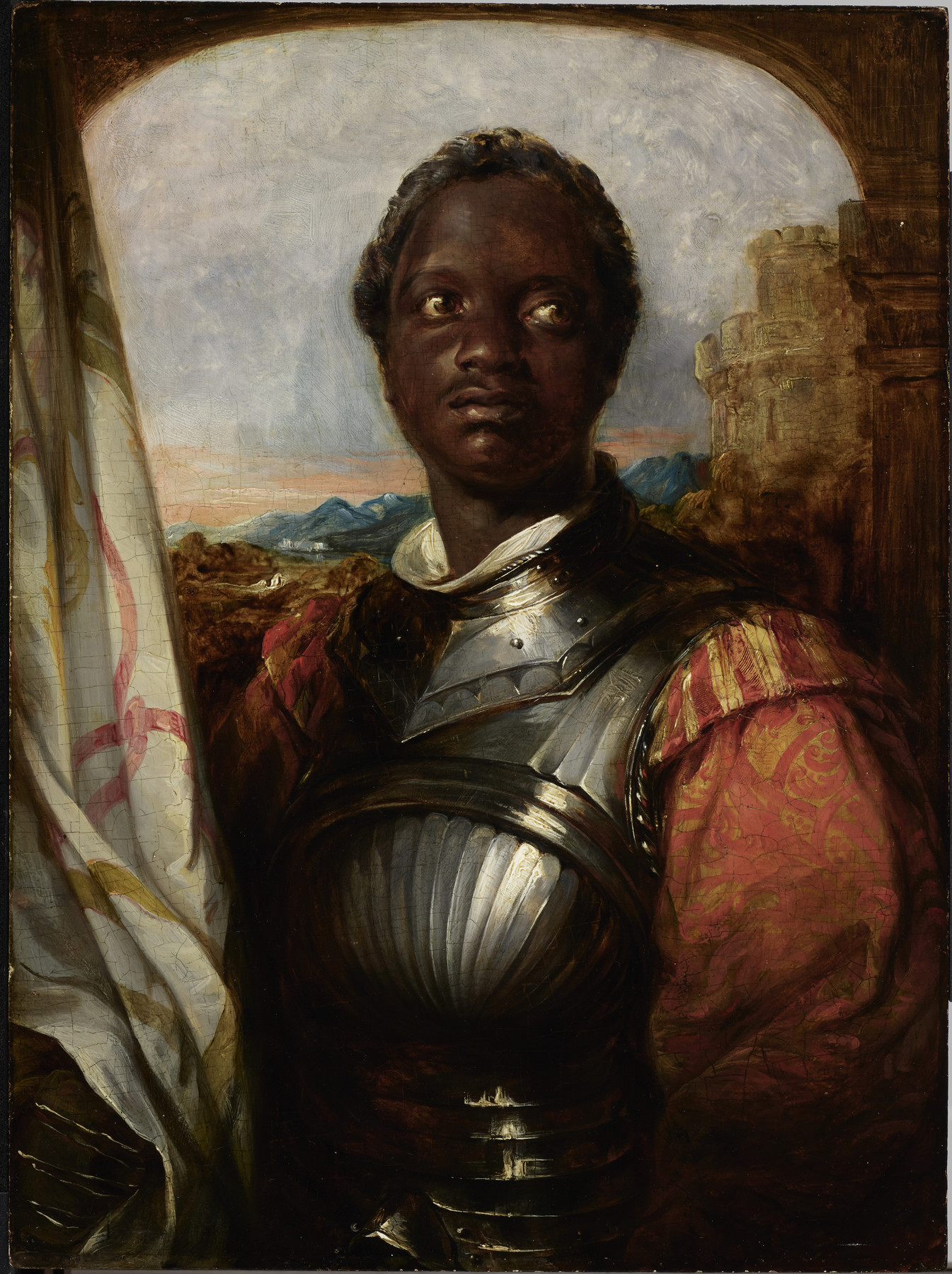 The production wastes no time in establishing its governing contrasts. Othello (Calvin Royal III) first emerges in Moorish dress, prostrated in Islamic prayer beneath looming shadows. Goldenthal’s overture breaks open with percussive force and harsh dissonance; moments later, a gleaming crucifix floods the stage with light as the music resolves itself into consonant sweetness. Here we have a schematic expression of the forces that drive Shakespeare’s play, with Othello poised at their volatile intersection: he is, after all, both an insider and an outsider, a Moorish general in Venetian service against the Ottomans and newly wed to the noblewoman Desdemona (here, his Christian conversion is depicted as equally recent). Bound to a patrician daughter of Venice, derided by his enemies as a savage, Othello is a man divided against himself.