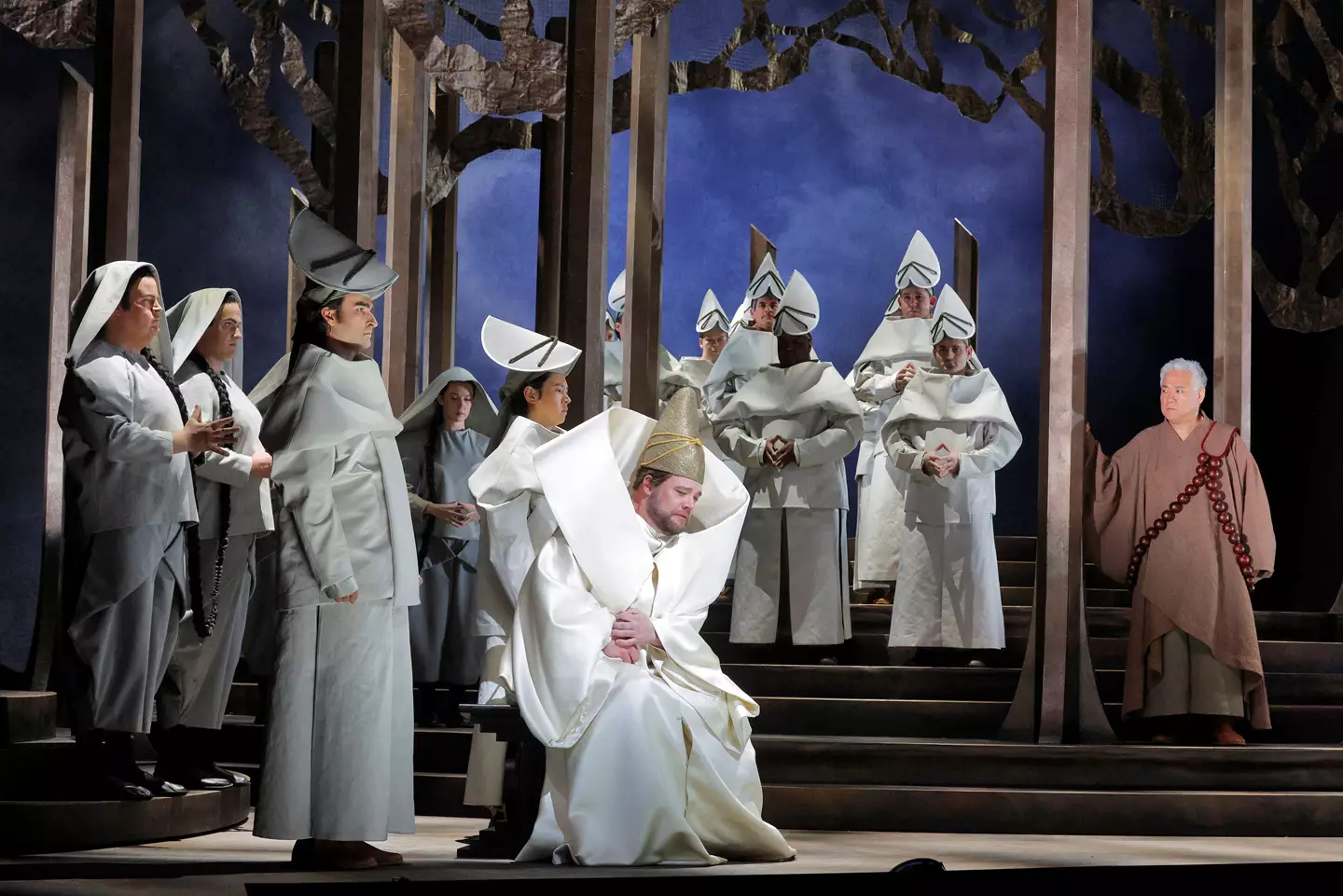 It would be hard to guess what those traditions, rituals, and forms are without reading the director’s program note, but this is not an inherently unfounded approach to an opera that tells a Christian legend and refracts elements of Buddhism through the lens of Schopenhauer’s philosophical understanding of that religion. The visual effect here, however, left this Parsifal curiously unmoored. Robert Innes Hopkins’s sets somewhat suggest the realm of the Grail—a crude forest and an unfinished temple—but they were too stylized either to recreate the opera’s original mythical setting or to replace it with another coherent framing.