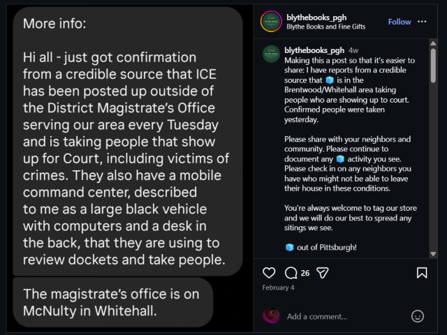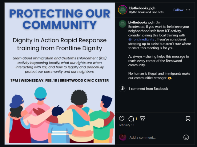 Blythe Books owner Lizzie McCoy has used her store’s Instagram page to warn people when U.S. Immigration and Customs Enforcement (ICE) agents were in the area, Pittsburgh’s Public Source reported Monday.