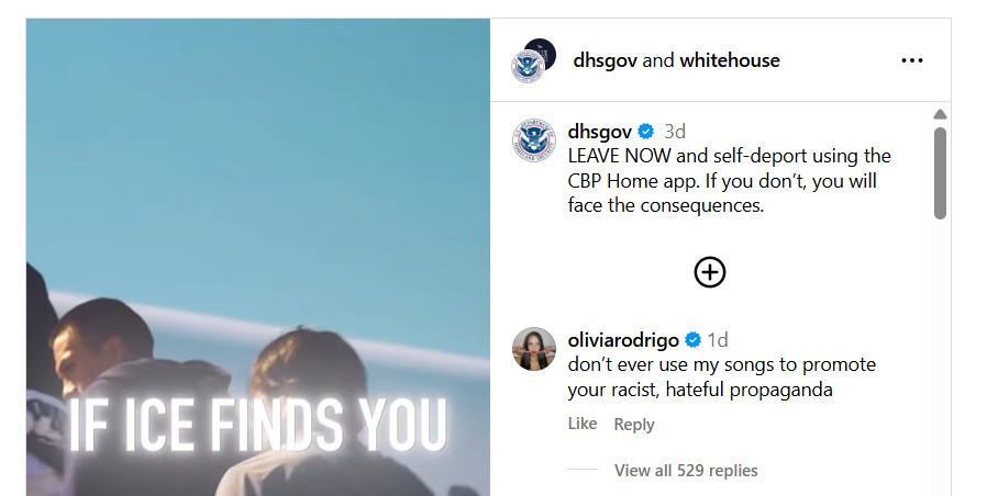 Pop star Olivia Rodrigo left an angry comment on a social media post from the Department of Homeland Security (DHS) scolding the federal agency for using one of her songs in a video about deportations.