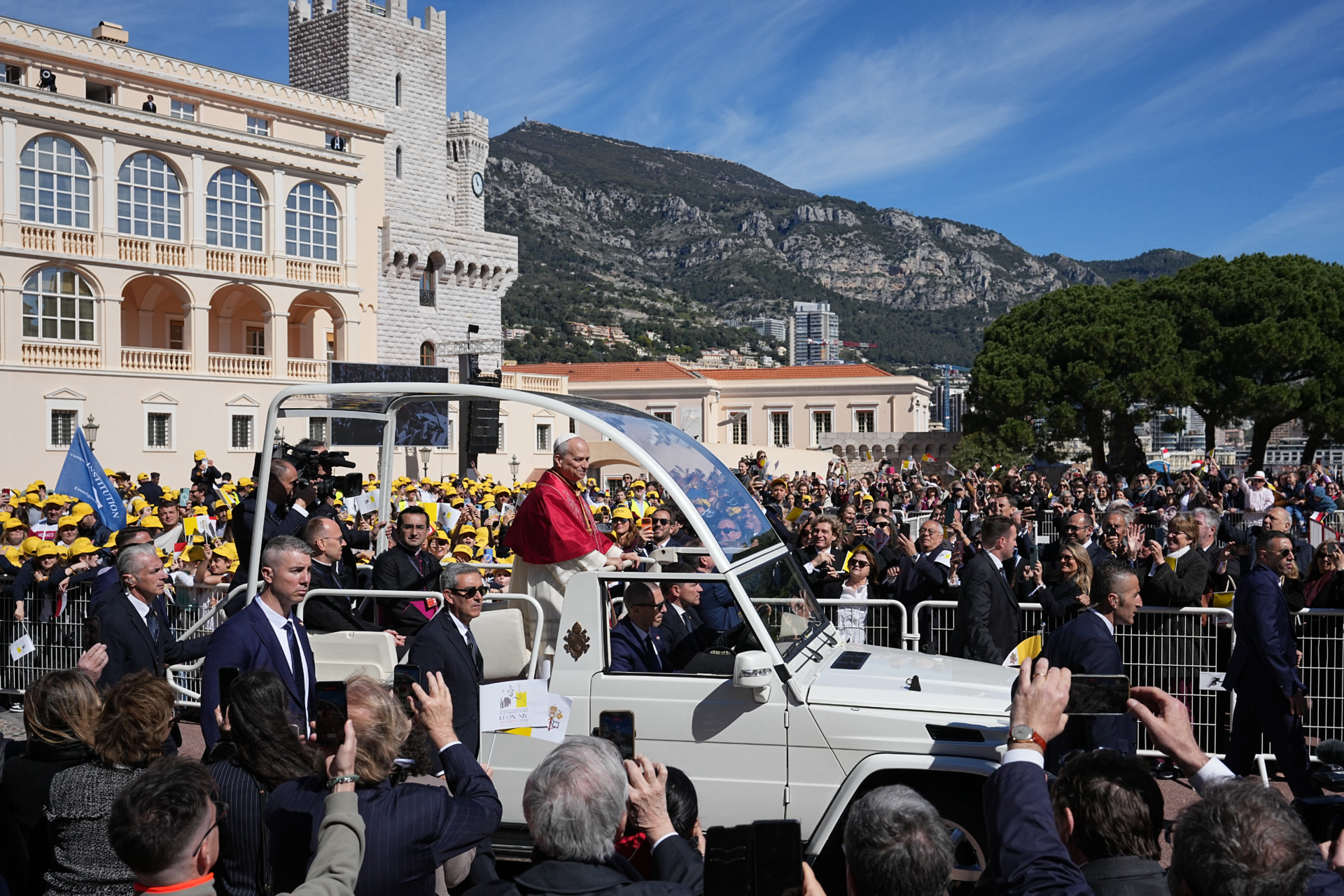On a sunny spring day, many people flocked to the palace grounds to greet Leo and some lined the streets to wave Vatican and Monaco flags as his open-sided popemobile passed by.