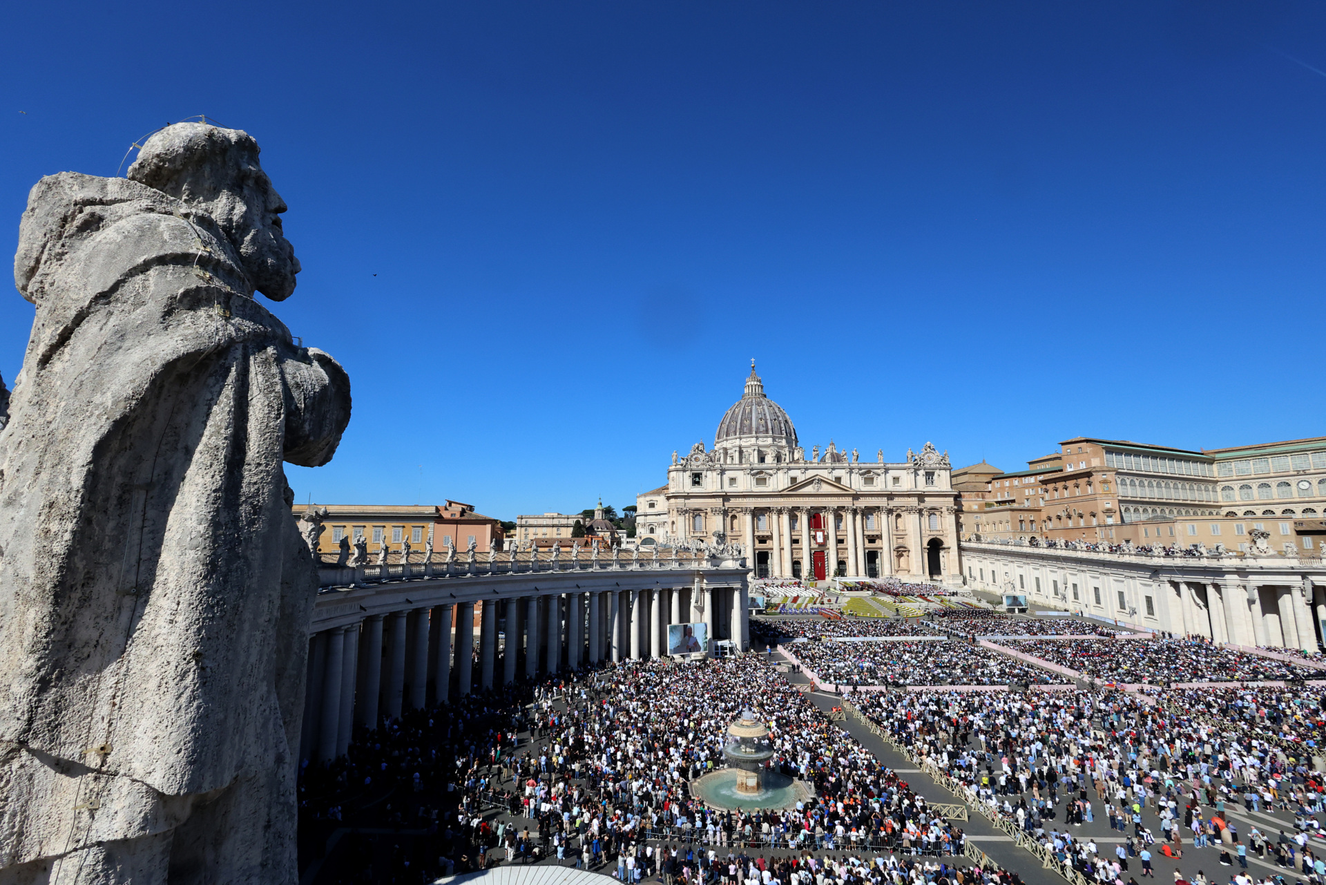 Earlier, Leo addressed some 50,000 faithful from an open-air altar in St. Peter’s Square flanked with white roses, while the steps leading down to the piazza where the faithful gathered were filled with spring perennials, symbolically resonating with the Pope’s words.