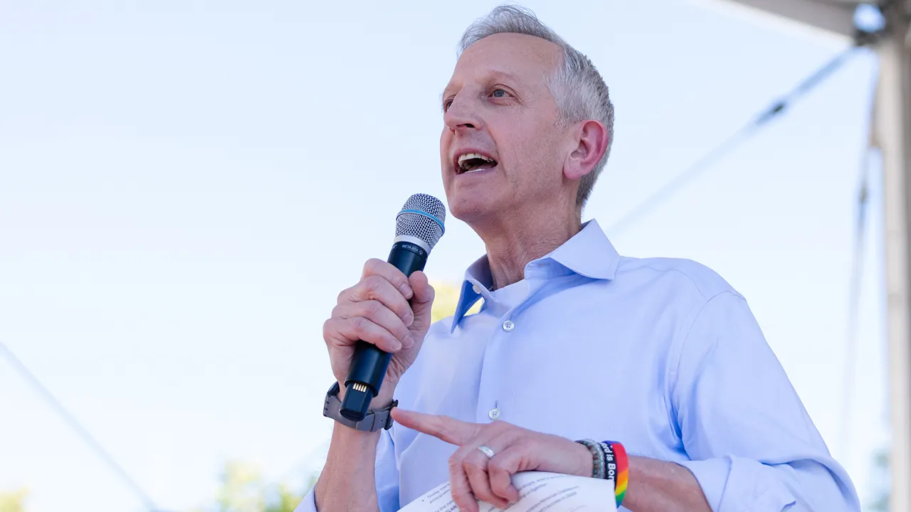 Portland Mayor Keith Wilson speaks to the crowd at the Moda Center during the Portland Fire WNBA Launch Party on July 15, 2025, in Portland, Ore. (Ali Gradischer/Getty Images)