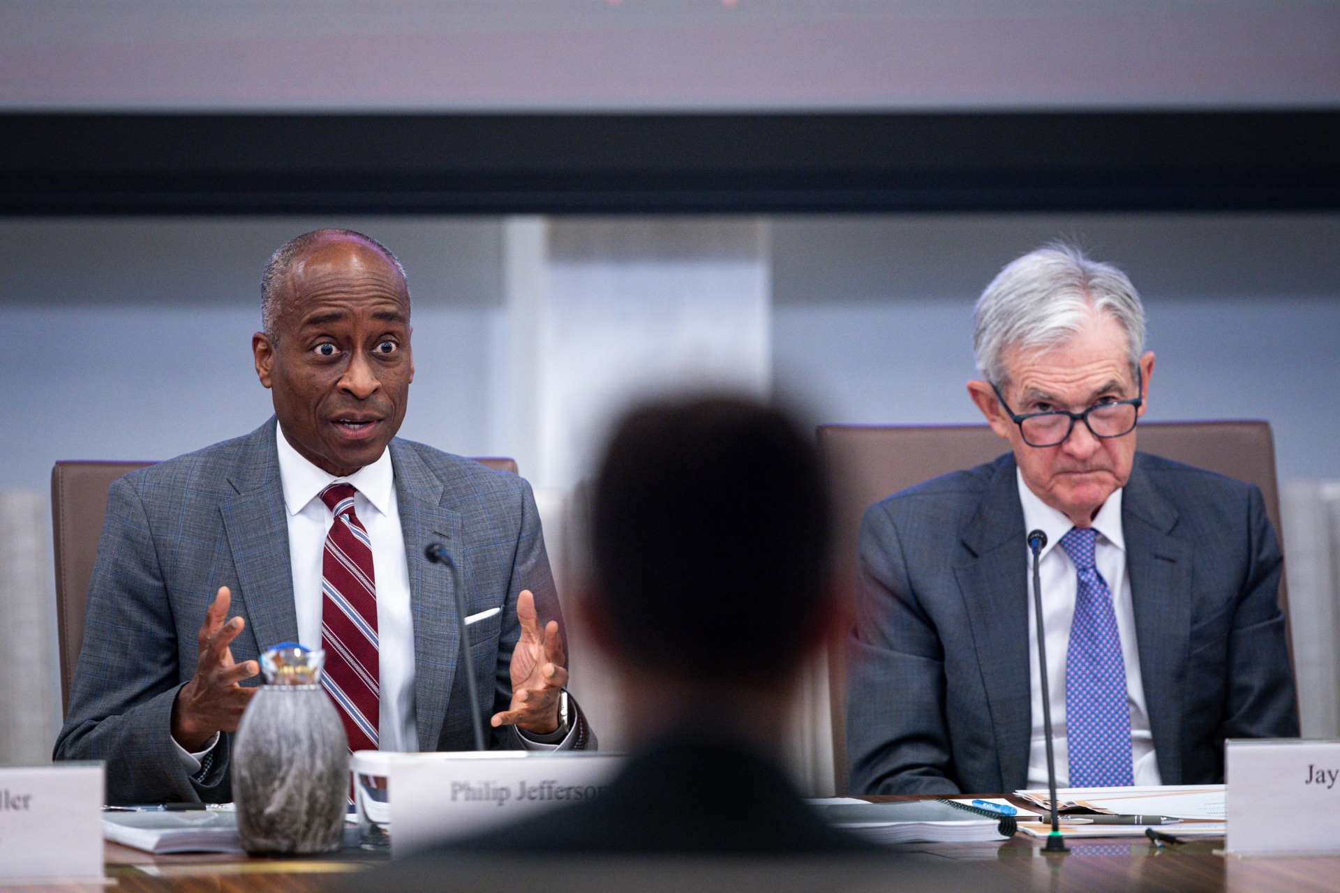 Federal Reserve Vice Chair Philip Jefferson (left) and Chairman Jerome Powell attend the Federal Reserve Board open meeting in Washington, DC, on Oct. 24, 2025. (Al Drago/Bloomberg via Getty Images)