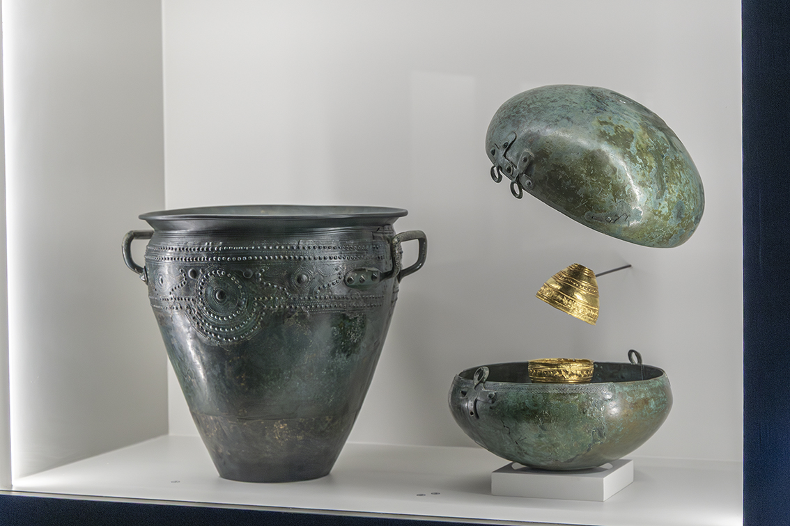 When we call the Bronze Age (2300–800 B.C.) prehistoric, that does not apply to ancient Egypt, Mesopotamia, and the ancient Israelites, whose history was recorded in written texts still available for consultation today. Compared to these civilizations, Western Europe was backwards and still many centuries away from developing writing, and therefore truly prehistoric. Nevertheless, an enlightening exhibition at France’s National Archaeological Museum, situated in Saint-Germain-en-Laye’s château (once home to James II after he was forced to forfeit the English crown in 1688), shows that the European Bronze Age was more dynamic than one might assume. Trade all over Europe was booming, facilitated by advances in maritime technology, as attested by a replica of a Bronze Age boat discovered in Dover in 1992, on view outside of the chateau; France, situated between northern and southern Europe, was a strategic crossroads. At the same time, men and women were finding ways to use new materials such as bronze (an alloy made of copper and tin), as well as gold and silver, to make cauldrons, jewelry, weapons and armor. Burial sites indicate that the Bronze Age in France saw the rise and fall of chiefs and warriors, heroes and villains whose names are lost for the lack of scribes to record their deeds.