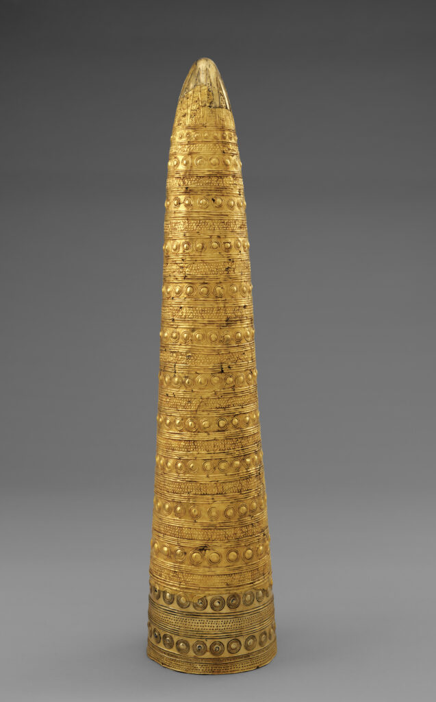 To this day, we remain intrigued by the stars above us. For Bronze Age peoples, the sky was full of symbols in the shape of crosses, stars, and circles, which frequently appear in their ornaments. The exhibition centers the striking Avanton Cone (1500–1300 B.C.), found near the French city of Vienne, an elongated twenty-two inch long “golden hat.” Its phallic shape was originally interpreted by archaeologists as relating to fertility, but nowadays its repoussé décor, composed of concentric circles and a star at the very tip, is understood as astronomical symbolism and maybe even a calendar. The sun was a predominant cult object and features prominently in Bronze Age art: a pendant in the form of a comb (900–800 B.C.) from the Jura region of France both serves a practical function and has the shape of a woman seemingly greeting and worshipping the sun with upraised arms. A large bronze ring used for chariot harnesses from the Loire region (900–800 B.C.) is interpreted as symbolizing the solar cycle and the renewal of life after death. Bronze, especially when polished, reflected the sun’s golden rays.