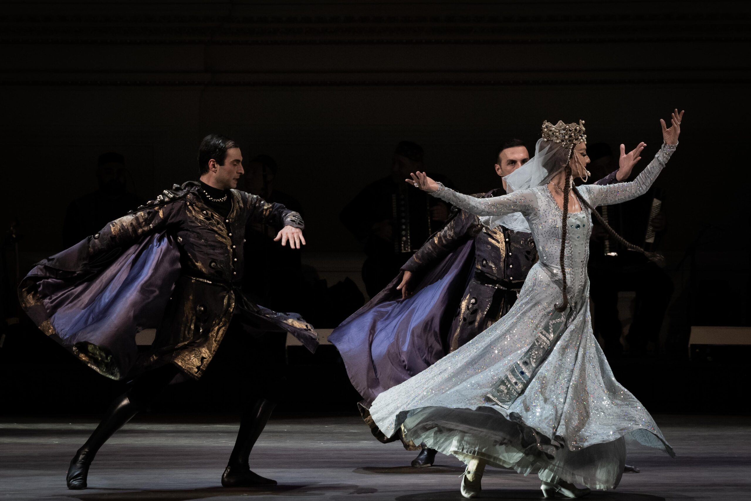 Among the most striking dances was “Samaia,” choreographed by the founder Iliko Sukhishvili, featuring three women elaborately costumed and headdressed like Orthodox icons. Spotlit on a dark stage, they rotate facing outwards in a tight circle before dispersing around the stage to slow, mysterious music, sometimes pausing, with arm positions inspired by a medieval fresco of Tamar the Great (r. 1184–1213), the powerful Queen of Georgia who was later canonized. “Jara,” a fascinating 2025 creation by Sukhishvili Jr., isolates and slows down some of the fierce steps in the warrior sequences seen earlier in the night. “Simdi,” the penultimate showpiece, originating as a wedding dance, features long lines of men dressed in black and women in white advancing hand in hand, forming lines and crosses that rotate with razor-sharp accuracy that puts other dance companies to shame.