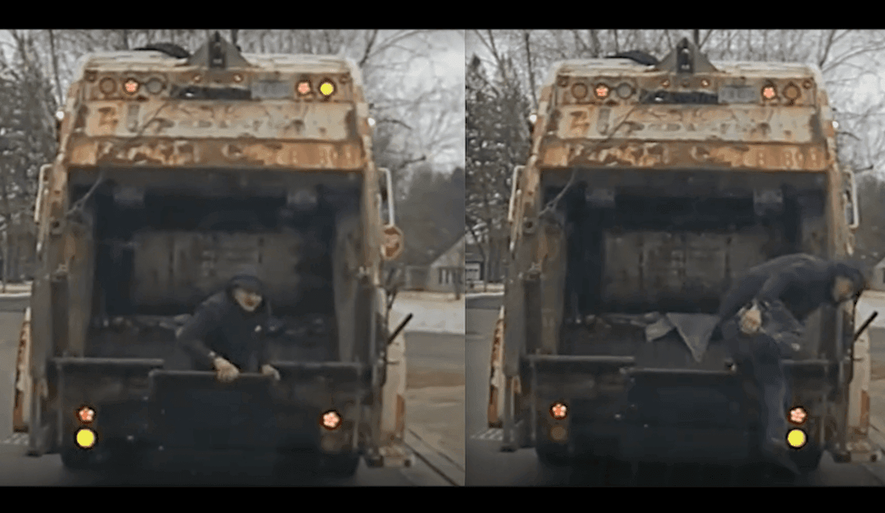 True enough. Police video shows an understandably freaked-out sanitation worker backing off and pointing at a just-opened trash bin behind a garbage truck.