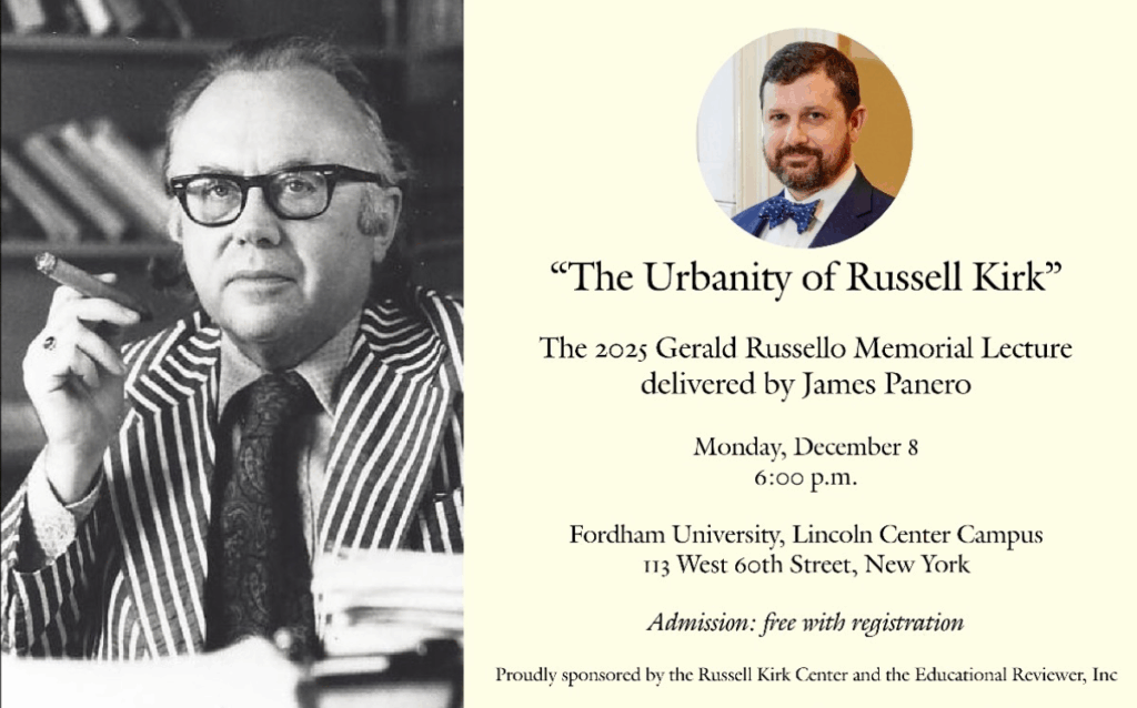 “The Urbanity of Russell Kirk,” featuring James Panero, at the Lincoln Center campus of Fordham University (December 8): Three years ago, the Russell Kirk Center inaugurated the Gerald Russello Memorial Lecture in memory of the late University Bookman editor and New Criterion contributor. Next Monday, December 8, at 6 p.m., I am honored to present the fourth lecture in this annual series at a reception on the Lincoln Center campus of Fordham University. My title is “The Urbanity of Russell Kirk.” What are the “ancestral shadows” of city life? Why do urban planners haunt Kirk’s stories? And is the automobile truly the “mechanical Jacobin,” as Kirk called it, of the American landscape? Come learn about Kirk and the city as we remember our friend Gerald (1971–2021) in this event co-sponsored by the Educational Reviewer. Attendance is free with registration. —JP