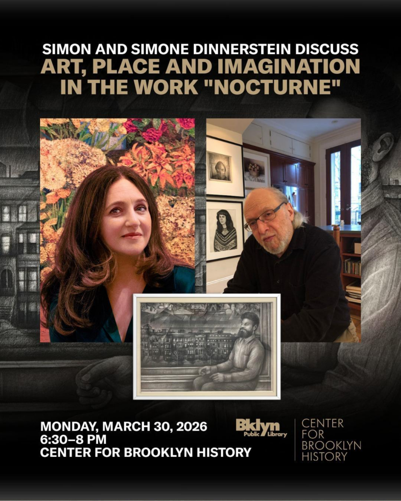 “Art, Place and Imagination in Nocturne,” featuring Simon and Simone Dinnerstein, at the Center for Brooklyn History (March 30): On Monday, March 30, the pianist Simone Dinnerstein will join her father, the painter Simon Dinnerstein, at the Center for Brooklyn History for a discussion about Simon’s Nocturne. The stunning 1982 work—created in Conté crayon and colored pencil on paper—depicts a man sitting at his Brooklyn window. It is a recent addition to the center’s collection and will serve as a starting point for a conversation about aspiration, place, and legacy. Simone, whose father has been painting her since her infancy, has a new album out in June and has recently incorporated Simon’s images into her performances. The evening talk at the Gilded Age Brooklyn Heights building designed by George B. Post promises to continue this intergenerational dialogue between the two Brooklyn-based artists. —⁠JP