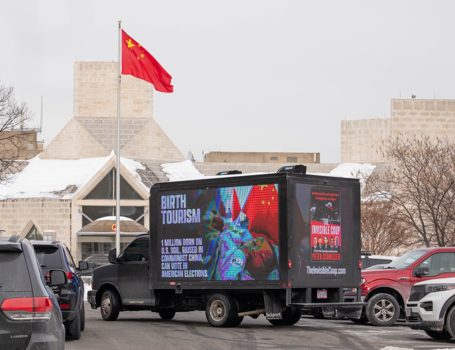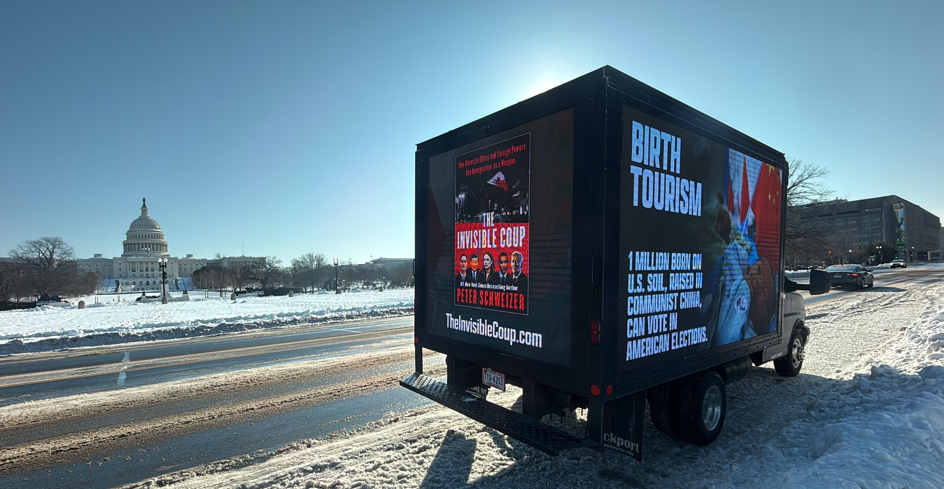 The billboard truck displayed a poster for Schweizer’s book on one side and a message on the other side stating: “BIRTH TOURISM” and “1 million born on U.S. Soil, raised in Communist China, can vote in American Elections.” It also included the website address for the book:  TheInvisibleCoup.com.