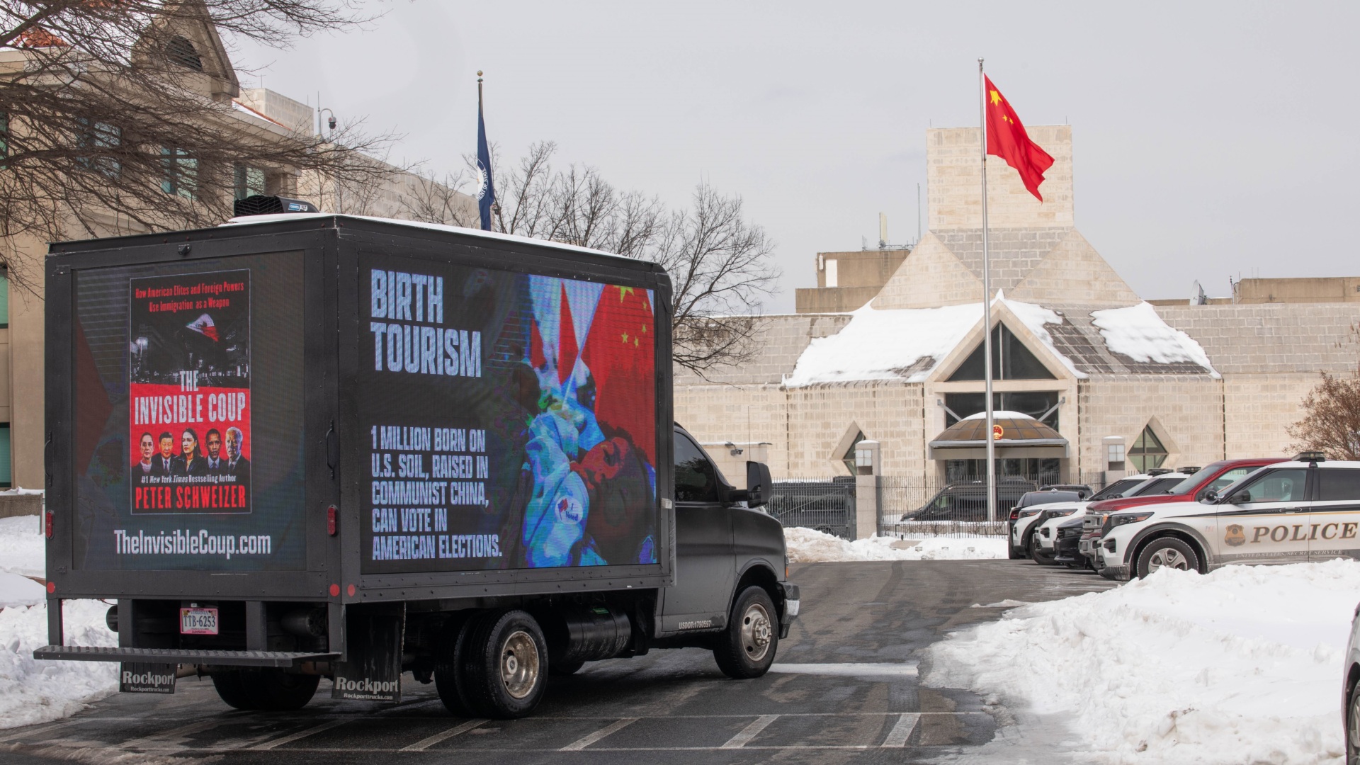 ‘The Invisible Coup’ Billboard Truck Takes Birth Tourism Bombshell to China’s Embassy Doorstep