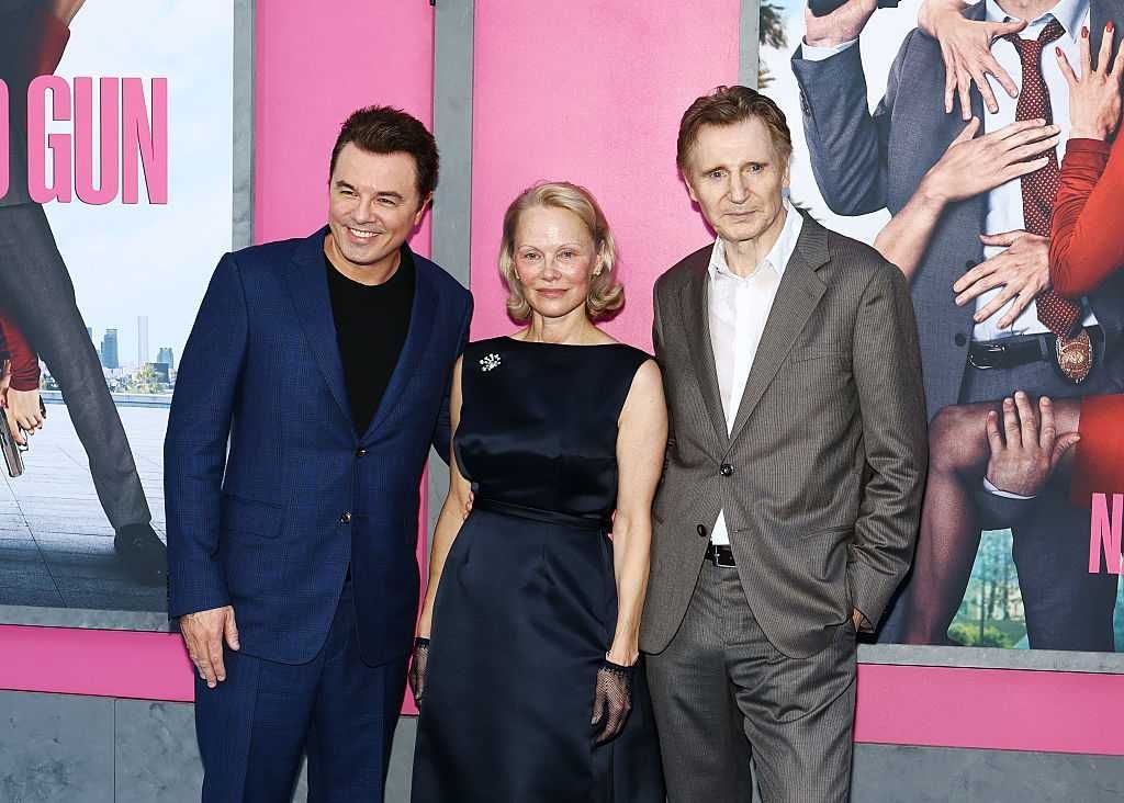 (L-R) Seth MacFarlane, Pamela Anderson, and Liam Neeson attend ‘The Naked Gun’ New York Premiere on July 28, 2025. Photo by Arturo Holmes/WireImage