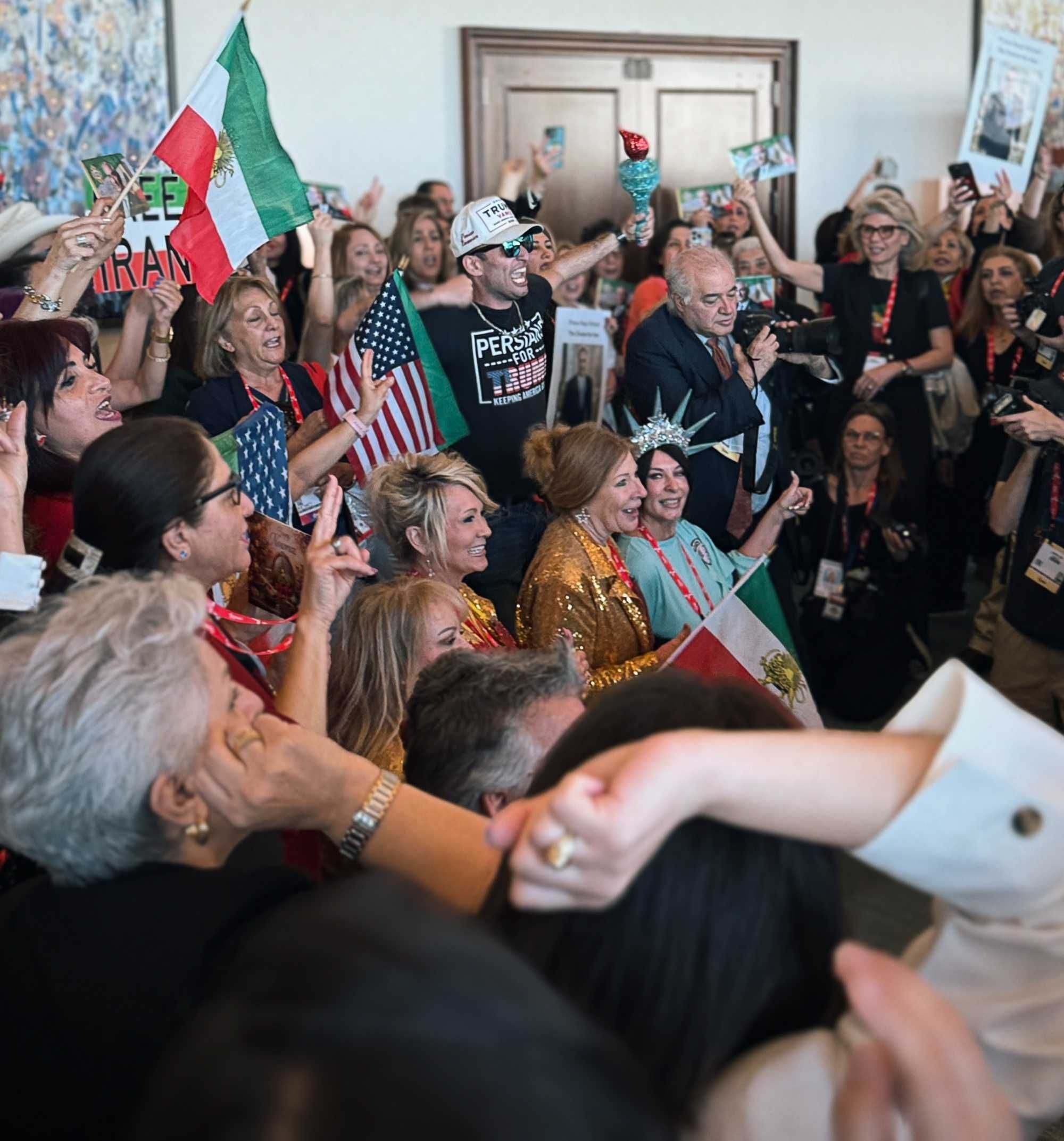 After they spoke, I heard loud shouting in the hallway. I grabbed my camera and shuffled off, along with most of the press corps, desperate for action. It was an extremely loud group of Persians, who, completely spontaneously and definitely not in some astroturfed way, began shouting slogans in Farsi while waving Iranian flags for the press. They held aloft signs saying MAKE IRAN GREAT AGAIN. They held pictures of Reza Pahlavi, the son of the former shah, wanting him to sweep back into power. One wonders why the fail-son of an autocrat from the 1970s who has been living in Maryland for the last 30 years would be the ideal leader for Iran in 2026. I have my doubts. When I later asked a young Iranian guy from Glendale, California, with tattoos and a MIGA hat if he would be returning to Iran, he seemed legitimately confused.