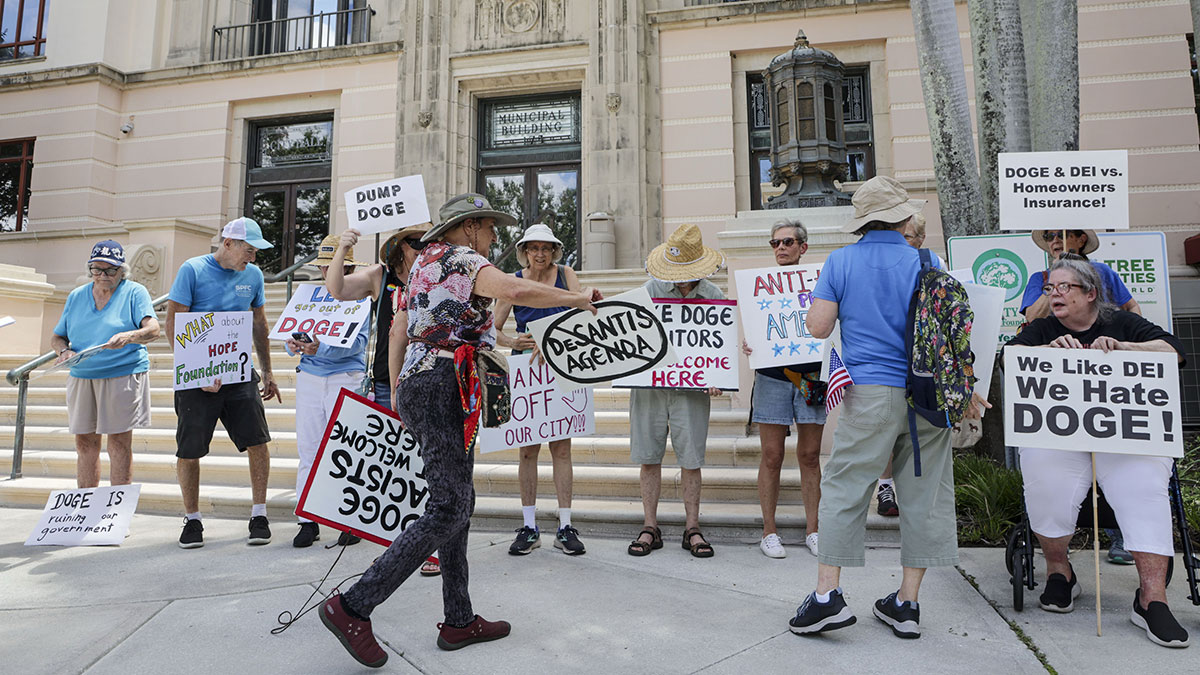 Top Photo: An anti-DOGE protest in Florida, where Governor Ron DeSantis made an ambitious push to find out what elected officials were doing with new revenue from rising tax receipts. (Douglas R. Clifford/ZUMA Press/Newscom)