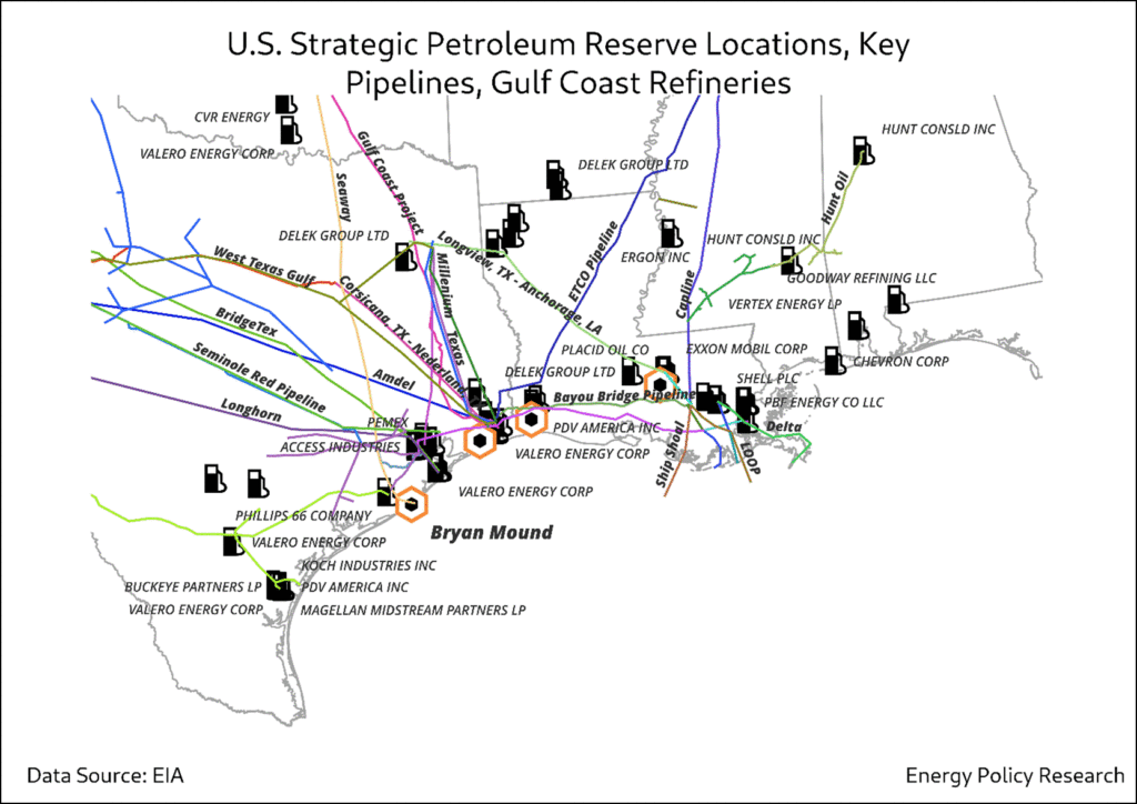 With the economic shock from the embargo, US political leaders set out to enact a myriad of new policies with the passage of the 1975 Energy Policy and Conservation Act (EPCA). The EPCA’s keystone component was the creation of the SPR, the most visible long-lasting institution of modern US energy security policy. The SPR is an emergency reserve of crude oil maintained by the US Department of Energy (DOE) and is held in salt caverns in four locations in Texas and Louisiana along the Gulf Coast. Coupled with a robust system of pipelines, terminals, and ports, oil from the SPR can be quickly distributed to Gulf Coast and Mid-Continent refineries as well as tankered to East Coast and West Coast facilities (Figure 2).