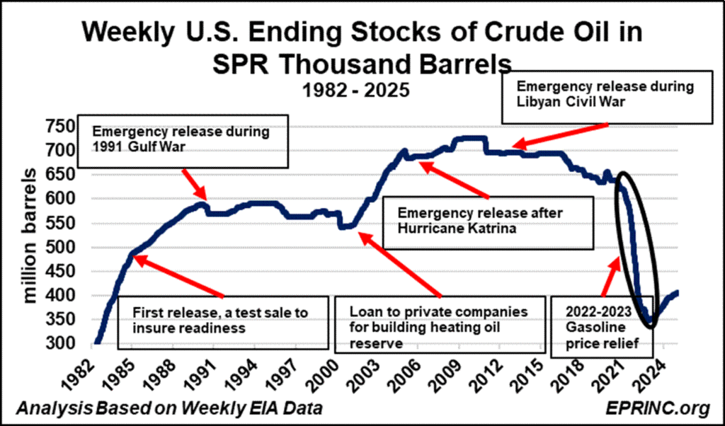 The 2021-2023 drawdown was the largest in the SPR’s history, depleting it by over one-third and exceeding the next largest release by a factor of almost ten. While modestly replenished with 50 MBs since then, this has left the SPR with an inventory of approximately 400 MBs, down over 50 percent from its peak of 726 MBs (Figure 1).