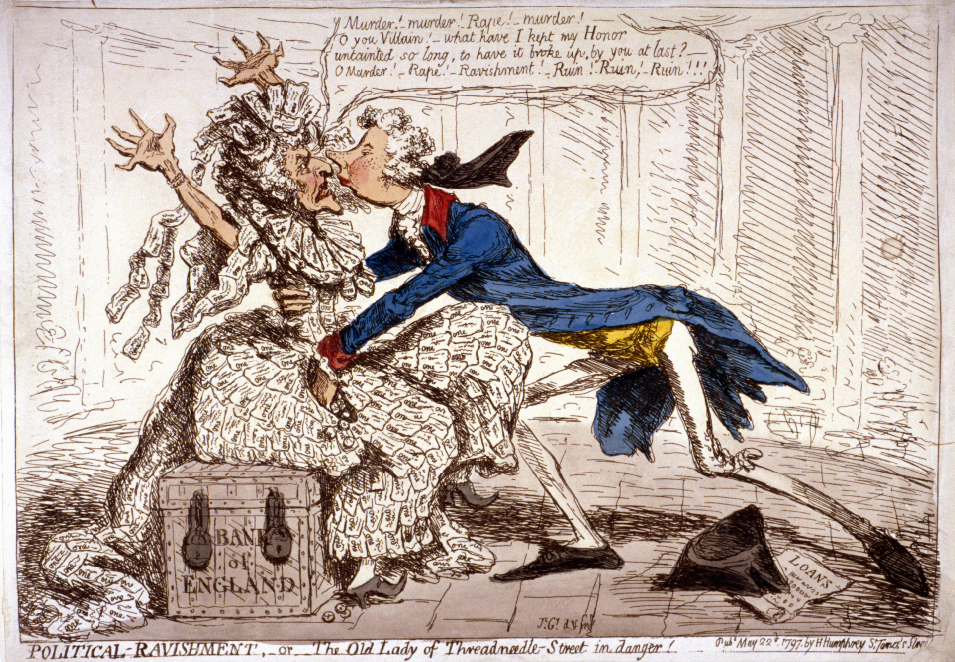 ‘Political ravishment, or the Old Lady of Threadneedle-Street in danger!’, 1797; showing a thin old woman dressed in one-pound notes, throwing up her arms in terror as William Pitt embraces her with his right hand and takes guineas from her pocket with his left. The satire is a protest against the introduction of paper money. (Photo by Guildhall Library & Art Gallery/Heritage Images/Getty Images)