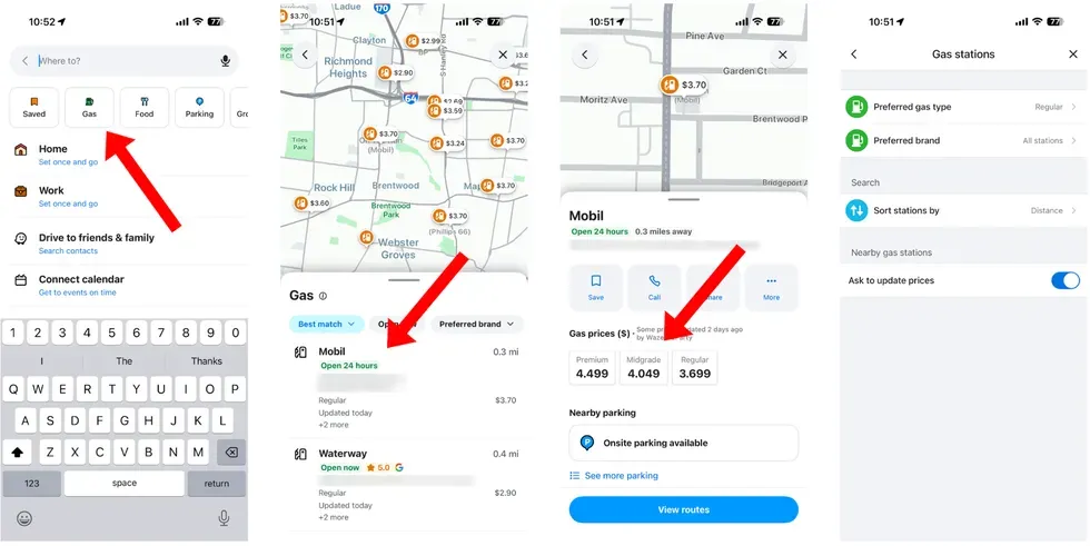 To see the prices in your immediate area, tap on the “Where to?” search bar and select “Gas.” Instantly, you’ll find a map of nearby stations, complete with markers advertising their lowest prices. Choose your favorite station to see a full list of prices on regular, mid-grade, and premium gasoline. On this screen, you’ll also see if the station has nearby parking to park your car so that you can go inside for drinks or snacks.