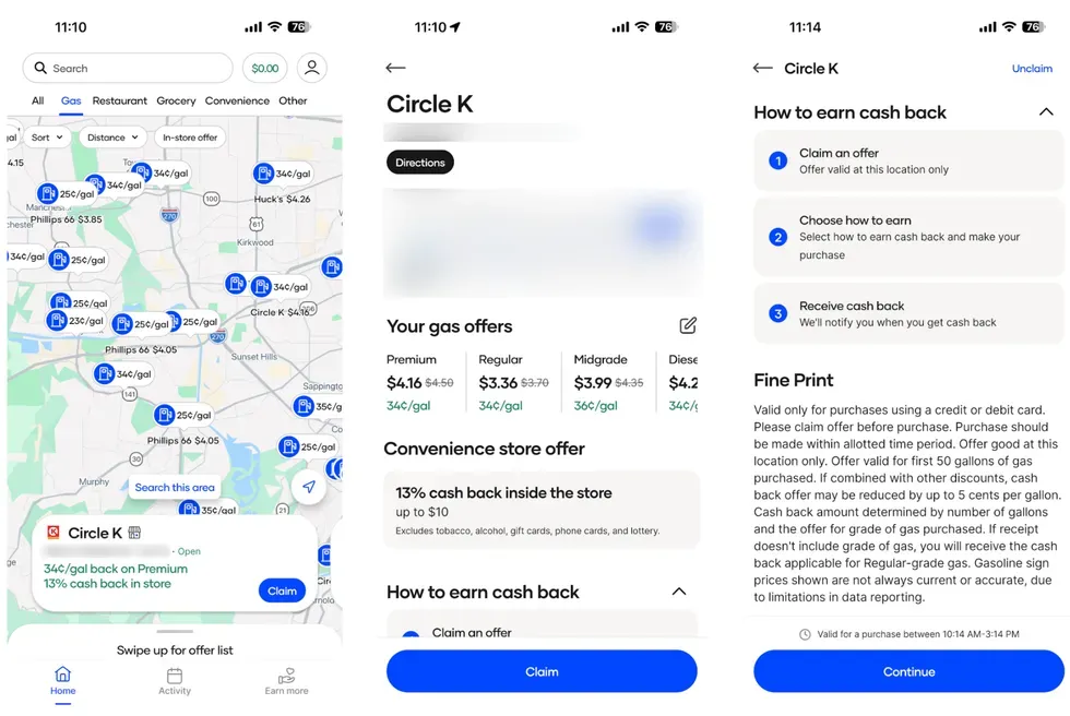 Unlike the other apps here that display gas prices on a map, Upside labels stations with the amount of cash back you can earn. To get direct price information, select your preferred station. Prices are listed by the amount you’ll save on premium, regular, mid-grade, and diesel. Make sure you tap “Claim” at the bottom of the page to redeem the offer, and read the fine print below for redemption details.