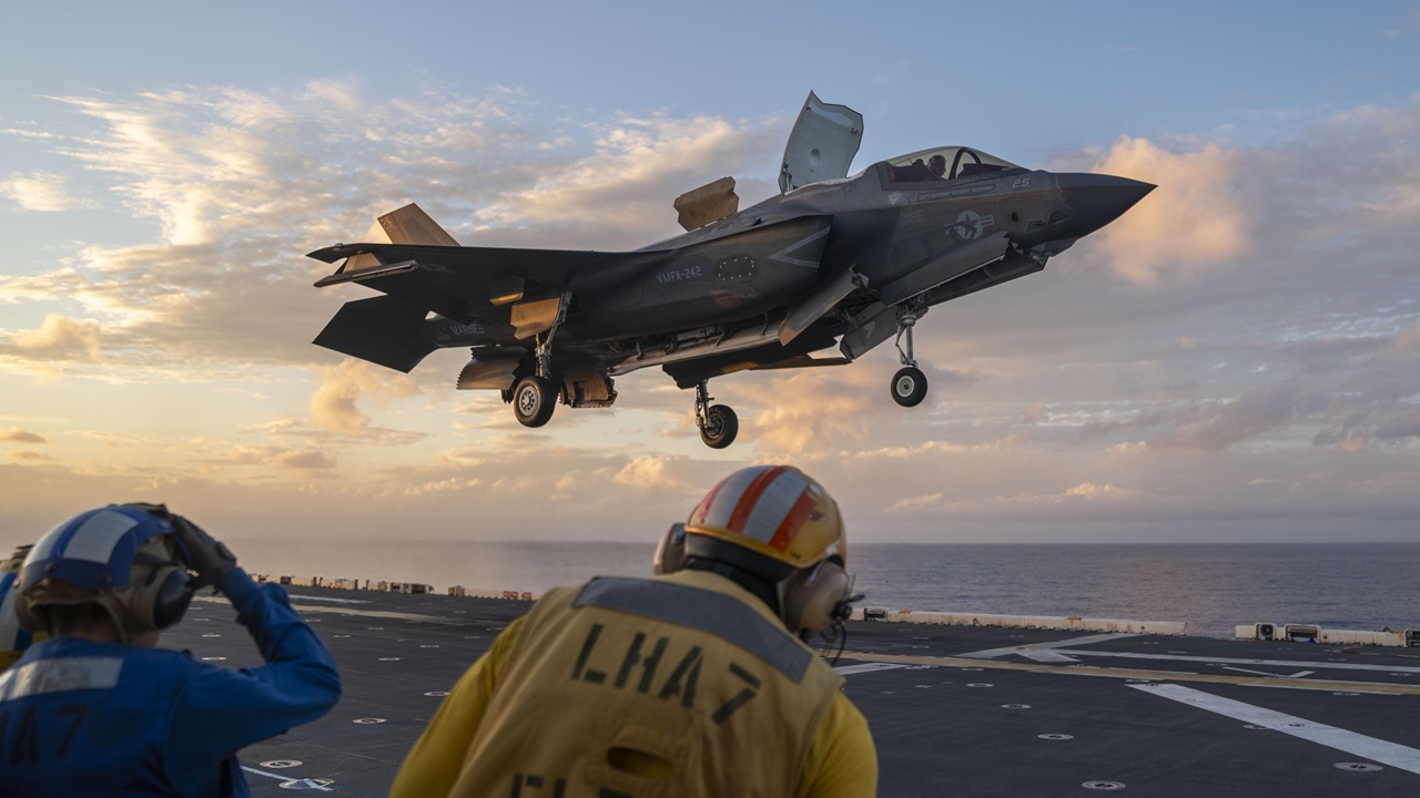 Embarked on LHA-7 is a detachment of F-35Bs from Marine Fighter Attack Squadron 242 (VMFA-242).