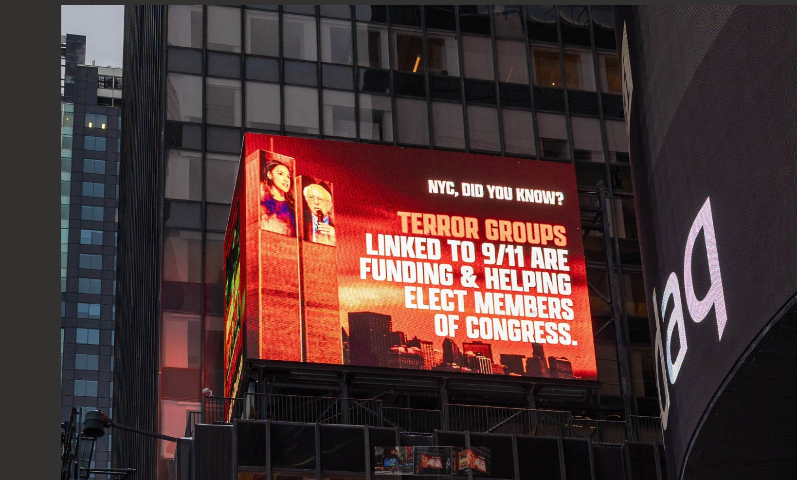 Displayed prominently above the New York Police Department’s Times Square substation, the billboard juxtaposes Schweizer’s book cover alongside the words: “NYC, did you know? Terror groups linked to 9/11 are funding and helping elect members of Congress.” The layout spans two panels: one side features the book cover, while the other presents a visual of the Twin Towers with the faces of Rep. Alexandria Ocasio-Cortez (D-NY) and Sen. Bernie Sanders (I-VT) superimposed atop them.