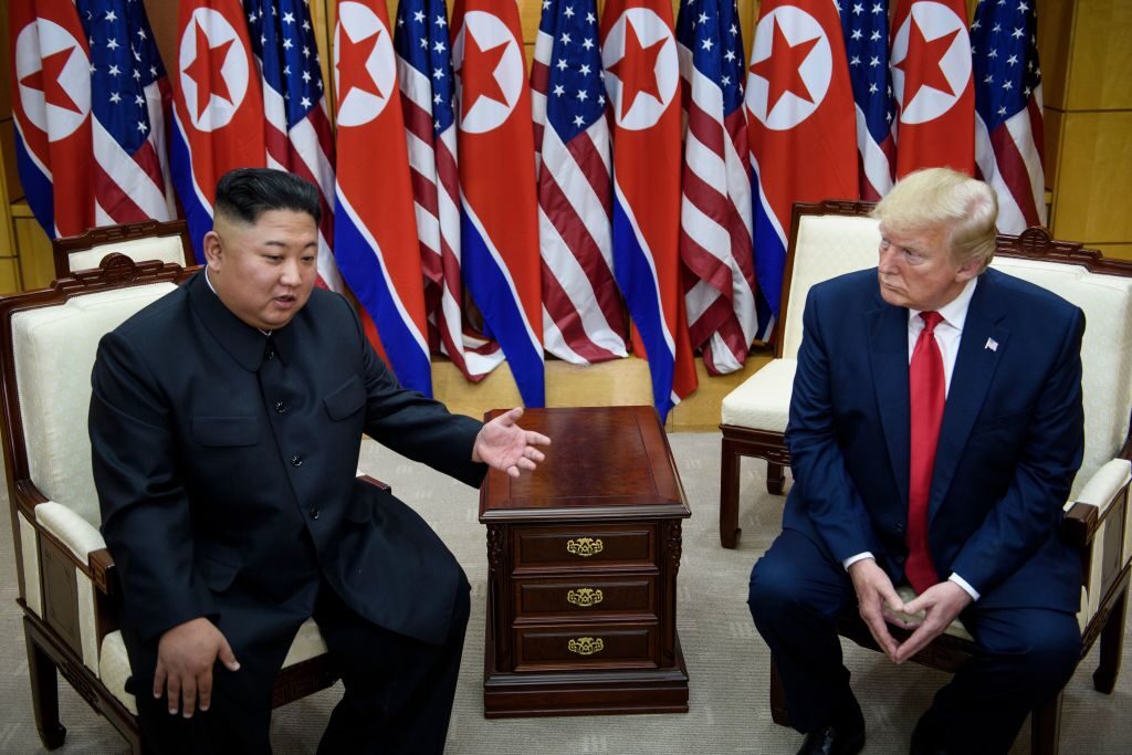 File/North Korea’s leader Kim Jong-un and US President Donald Trump before a meeting in the Demilitarized Zone (DMZ) on June 30, 2019, in Panmunjom, Korea. (BRENDAN SMIALOWSKI/AFP via Getty Images)