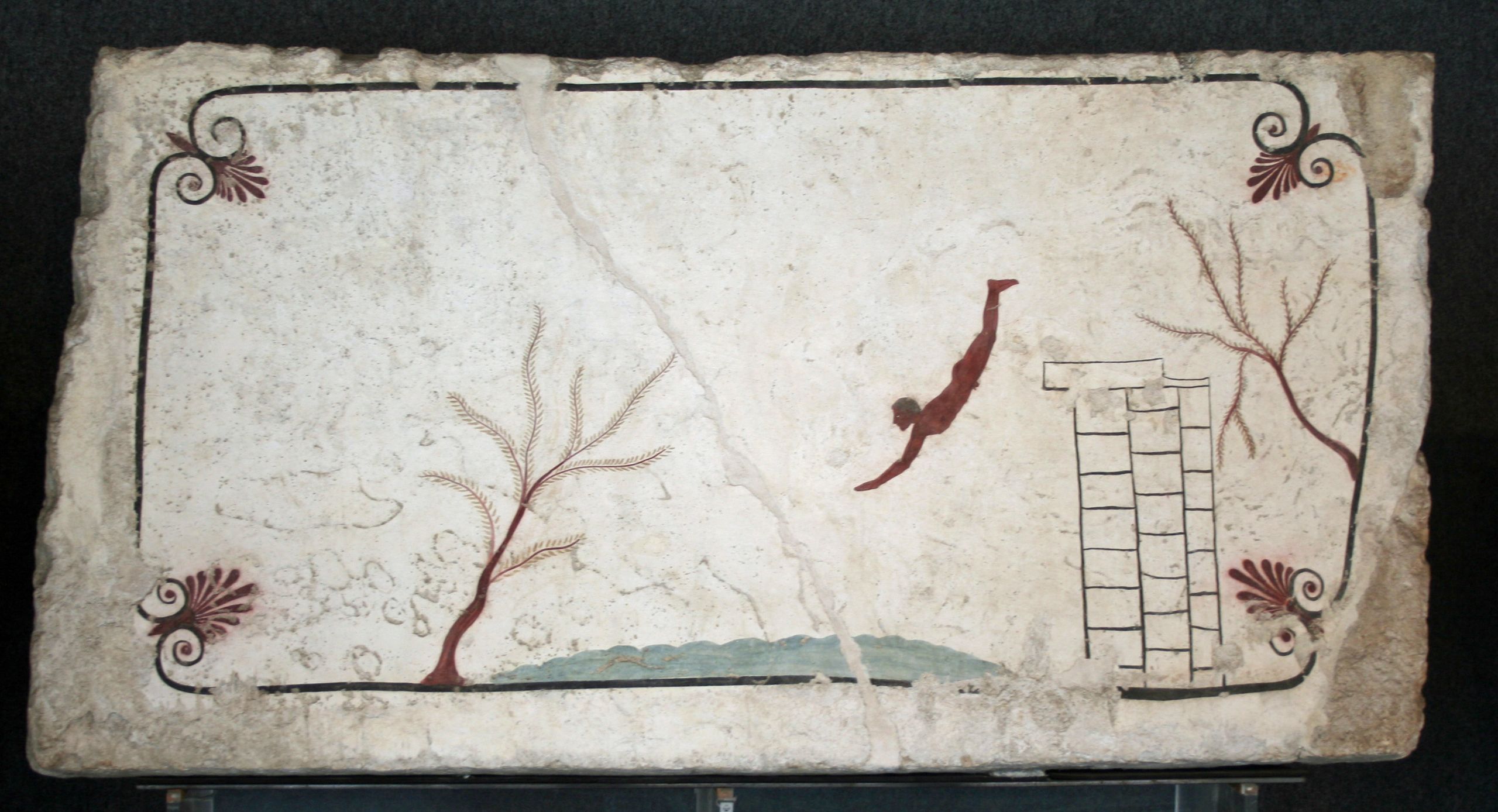 The Tomb of the Diver, located in the Greek colony of Poseidonia (now known by its Latin name of Paestum) in southern Italy, has the rare distinction of containing some of the only surviving Greek wall paintings from the classical period. By far the most famous image from the early-fifth-century B.C. tomb is that of a diving nude youth, who gives the anonymous burial its evocative name. Since the tomb’s discovery in 1968, most scholars have analyzed the iconography as relating to death: a jump into the abyss. That association has been conclusively debunked by Tonio Hölscher, who, in his recent work, The Diver of Paestum, argues that the dive represents initiation into the world of adulthood, not the realm of Hades. As Nigel Spivey writes, this interpretation makes a lot more sense, especially in light of the other wall paintings in the tomb, which show a symposium, a Greek institution by which young men were initiated into the domain of politics, philosophy, and love. Whether or not the youth buried in the tomb enjoyed literal diving, the erotic atmosphere of his final resting place, replete with pairs of recumbent men imbibing wine and flirting, suggests that he had at least fallen in love.