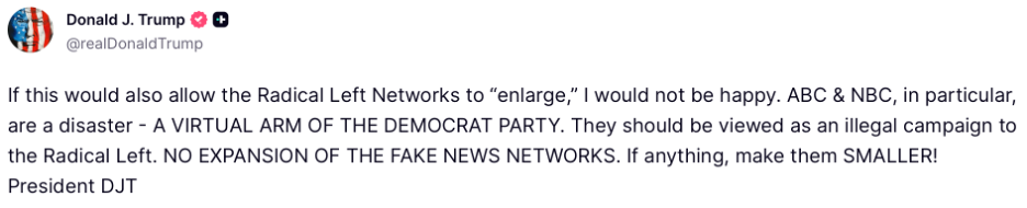 These underlying currents within the media landscape help drive the debate over broadcast ownership rules, which is turning into a fight between broadcast and cable. President Trump has been drawn into the middle of that fight, and he’s put down his marker. In the TruthSocial post heard round the media world, President Trump wrote of possible Federal Communications Commission action to reform or repeal the national ownership cap: “If this would allow the Radical Left Networks to ‘enlarge,’ I would not be happy. ABC & NBC, in particular, are a disaster . . . NO EXPANSION OF THE FAKE NEWS NETWORKS.”