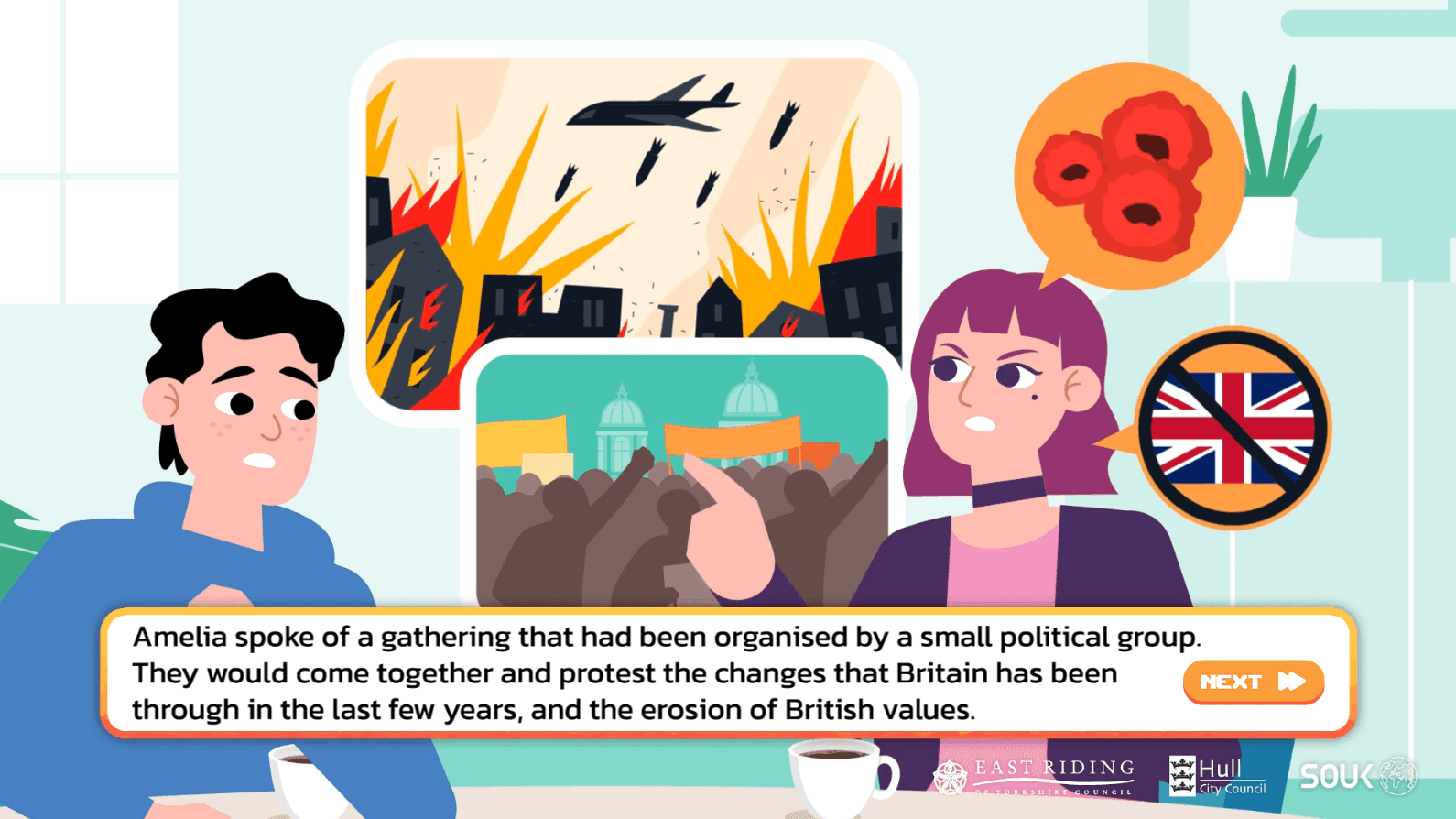 Amelia features prominently in the fourth scenario, where she is introduced as a close friend of Charlie who has “made a video encouraging young people in Birdlington to join a political group that seeks to defend English rights.”