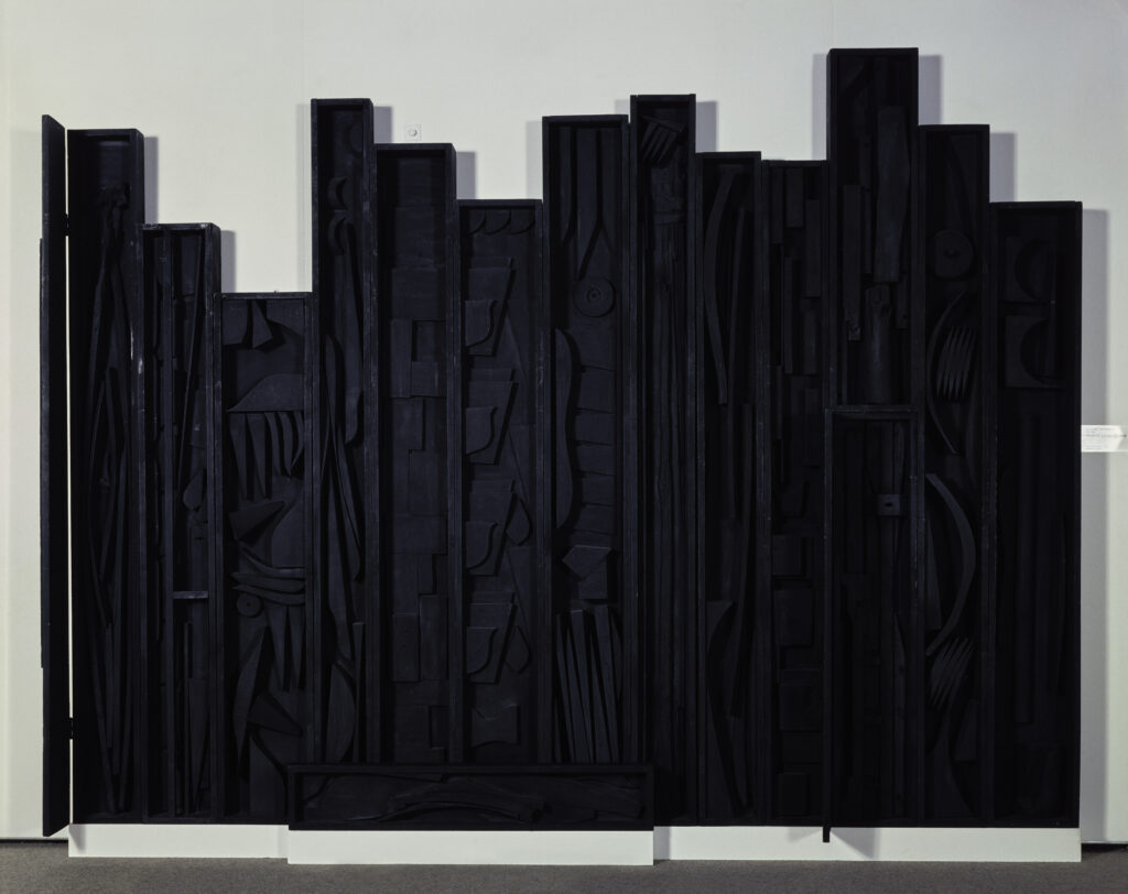 In 1931, she left her husband and packed off her son to her parents in Maine so that she could study Cubism in Munich. Four years later, back in New York, the New Deal’s Works Progress Administration gave her a living space and a shared studio. In 1941, Karl Nierendorf, who also exhibited Paul Klee, Otto Dix, and Wassily Kandinsky, organized her first solo show at his gallery. Although she felt most at home in New York because of the city’s endemic chaos, Mexico, with its Mayan sites in the Yucatan, was for her “a world of geometry and magic” and had a strong effect on her art. In addition to her sculptures, she created collages and enigmatic pictures on paper that betray a Surrealist influence, such as The Magic Garden (1953–55), which features mysterious floating figures and uncanny expressions. In the same period, she made Goddess from the Great Beyond. An angular face stares out at the viewer, while the fluid outlines of the rest of the body seem to contain a dark sky dotted with isolated stars. These etchings resemble a child’s deranged dreams. In 1956, the Brooklyn Museum bought her First Personage, a large, vertical black slab that is sleek on one side but has spikes coming out from the other. Nevelson called the work her autobiography, although to a less attuned viewer it might seem more like a life-size turnstile. A picture of Nevelson standing next to the sculpture reveals a challenging kind of beauty reminiscent of Greta Garbo. By 1958, Nevelson’s works were being exhibited not only in New York but also in Paris, at the Galerie Jeanne Bucher.