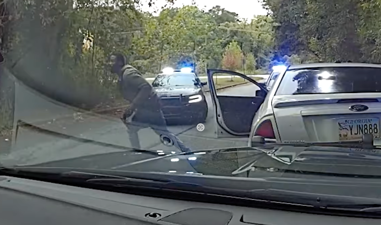 While running from his car, the suspect threw the gun into an adjacent wooded area, after which officers took him down to the street.